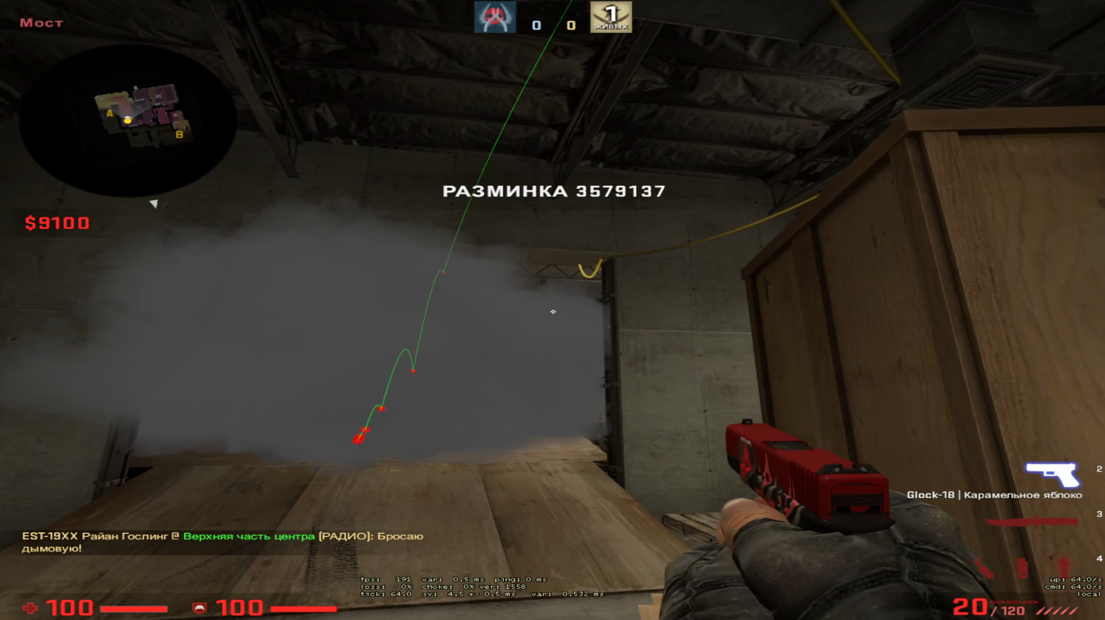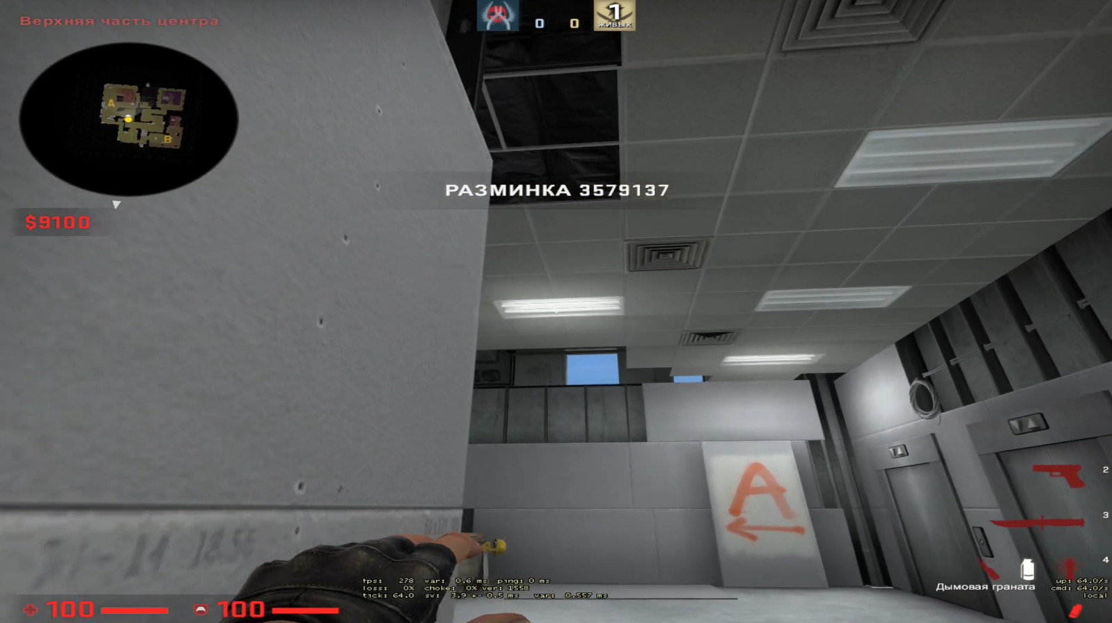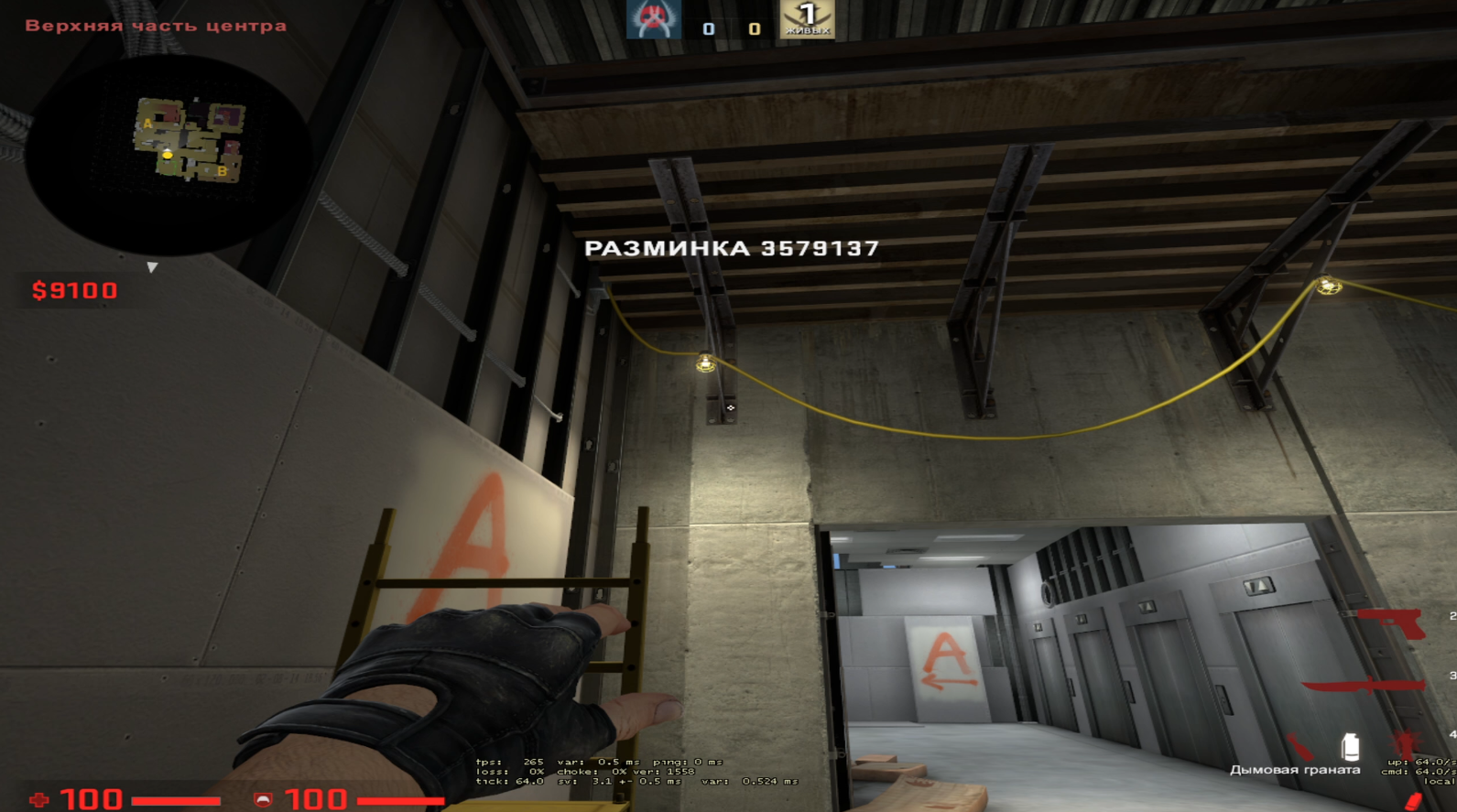 С кт респа бежим в коннектор, целимся на нижнюю точку стены, как показано на видео. После бежим по ближней стенке и отпускаем гранату примерно на уровне середины лампы. Дымовая граната падает в глубину рампы и позволяет вам пикать с шорта, цемента или крана. Терры не смогут безнаказанно запушить в смок, а вы на ранних таймингах удержите пуш. Комбинируйте гранату с хаешками и моликами вглубь, чтобы отзонить соперников и нанести дамаг.