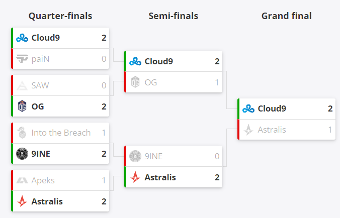 Восемь коллективов устроили жесткую борьбу в плей-офф, где в одном из матчей случился казус у победителей ивента. В поединке Cloud9 vs OG игроку “облаков” HObbit стало плохо и на карте Overpass его заменил недавно кикнутый interz. Замена не помешала Cloud9 обыграть OG и выйти в финал против Astralis.