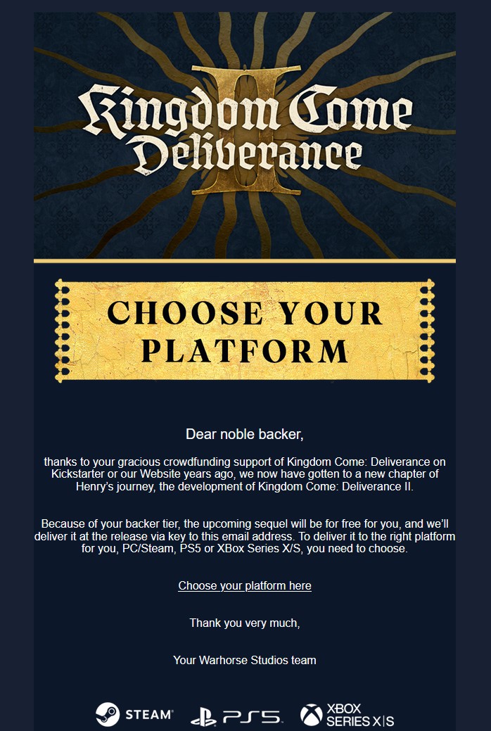 Если вы преданный фанат первой части и вкладывали свои кровные в ее разработку, то авторы отправят вам копию Kingdom Come: Deliverance 2 бесплатно. Об этом сообщили разработчики в рассылке всем участникам краудфандинговой кампании приквела.