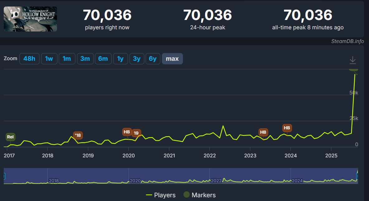 Вечером 31 августа в Hollow Knight одновременно играли более 70 тысяч человек — втрое больше прежних рекордов. Рост активности совпал с объявлением даты выхода Silksong и распродажей оригинала со скидкой 50%.