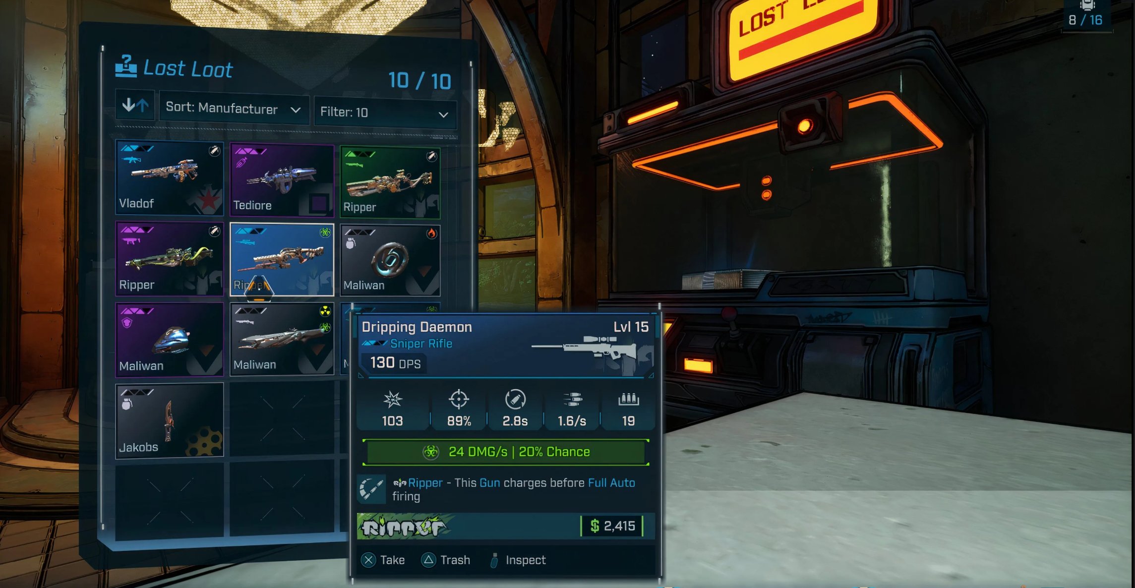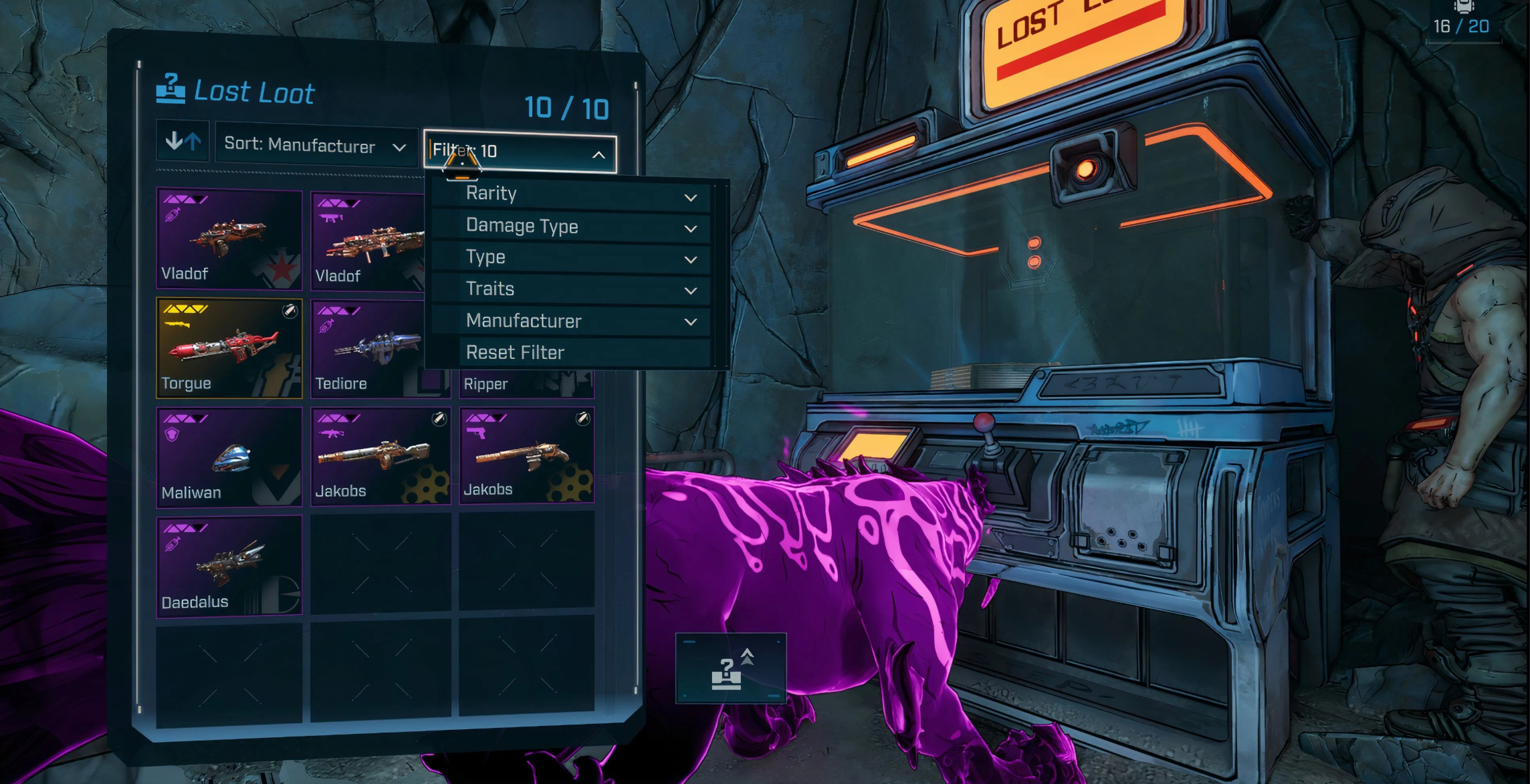 Машину потерянной добычи можно найти во всех крупных городах на планете Кайрос. Подойдите к механизму и нажмите кнопку взаимодействия, после чего вы сможете просмотреть список всех пушек, которые вы пропустили после сражения. Не забывайте, что размер инвентаря машины ограничен, но его можно расширить за счет Жетонов улучшения хранилища, которые можно получить за выполнение побочек или нахождение особых предметов.