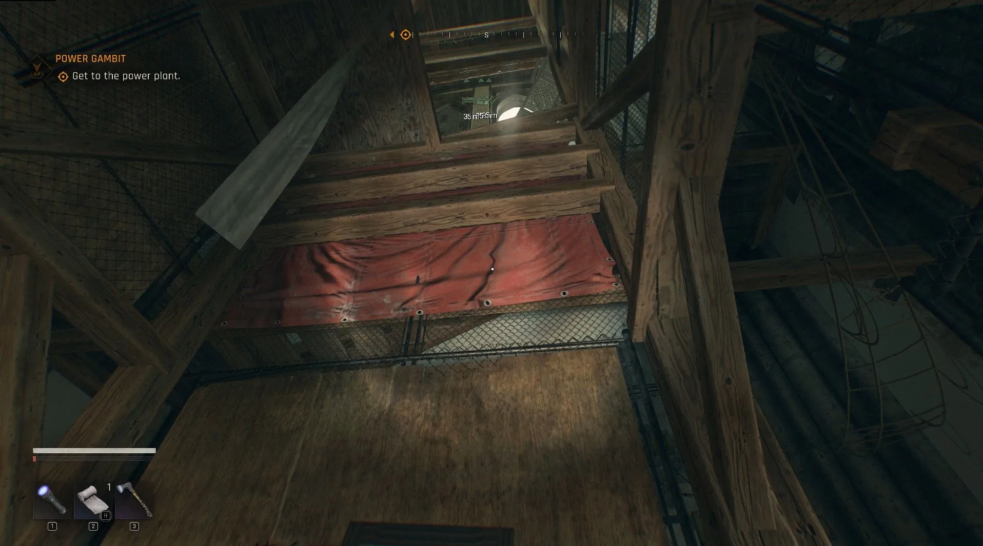 Заберитесь туда, а затем откройте ворота, после чего идите по деревянным блкам до окна. На стене рядом с ним вы увидите красные кирпичи, на которые можно забраться, чтобы перепрыгнуть на балку с красной тряпкой.
