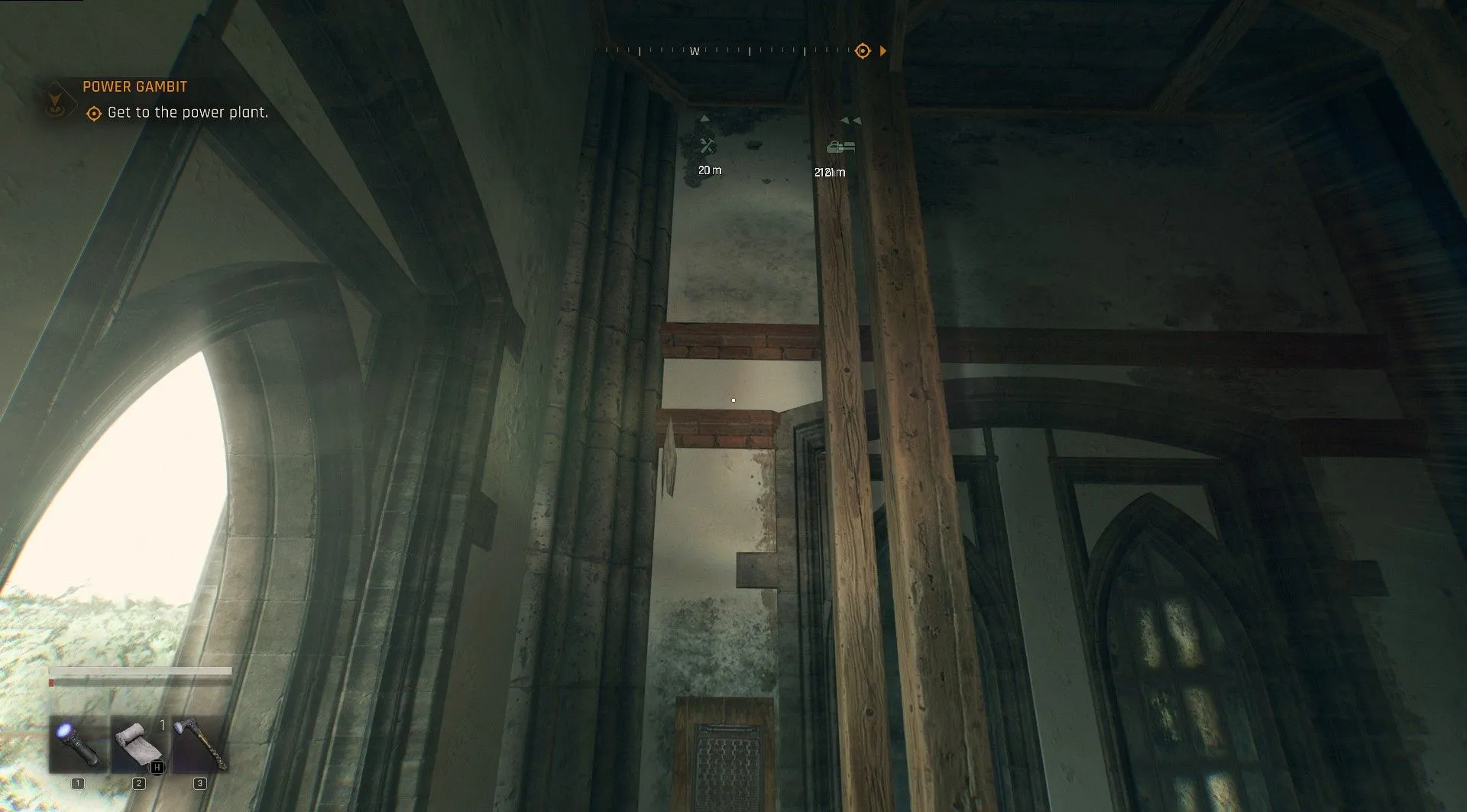 Внутри найдите металлическую решетку, над которой виднеется выступ, ведущий на следующий этаж.