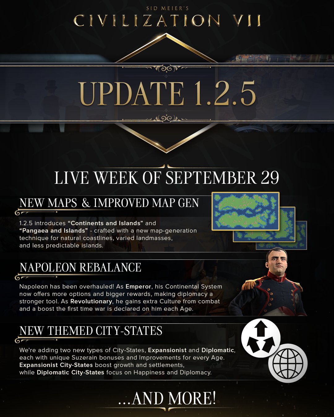 Разработчики Civilization 7 анонсировали апдейт 1.2.5, который принесет новые карты, улучшенную генерацию, а также города-государства экспансионистов и дипломатов. Обновление также переработает баланс правителя Наполеона.