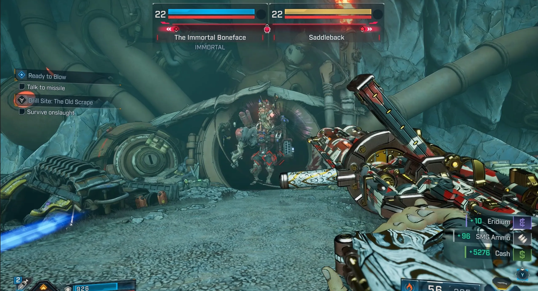 Здесь вам понадобится разобраться с Бессмертным Костяным Ликом, который представляет из себя огромного меха, пилотируемого человеком по имени Сэддлбэк. Разберитесь с мехом, чтобы добраться до пилота, который с большим шансом дропнет вам легендарный дробовик Думгая.