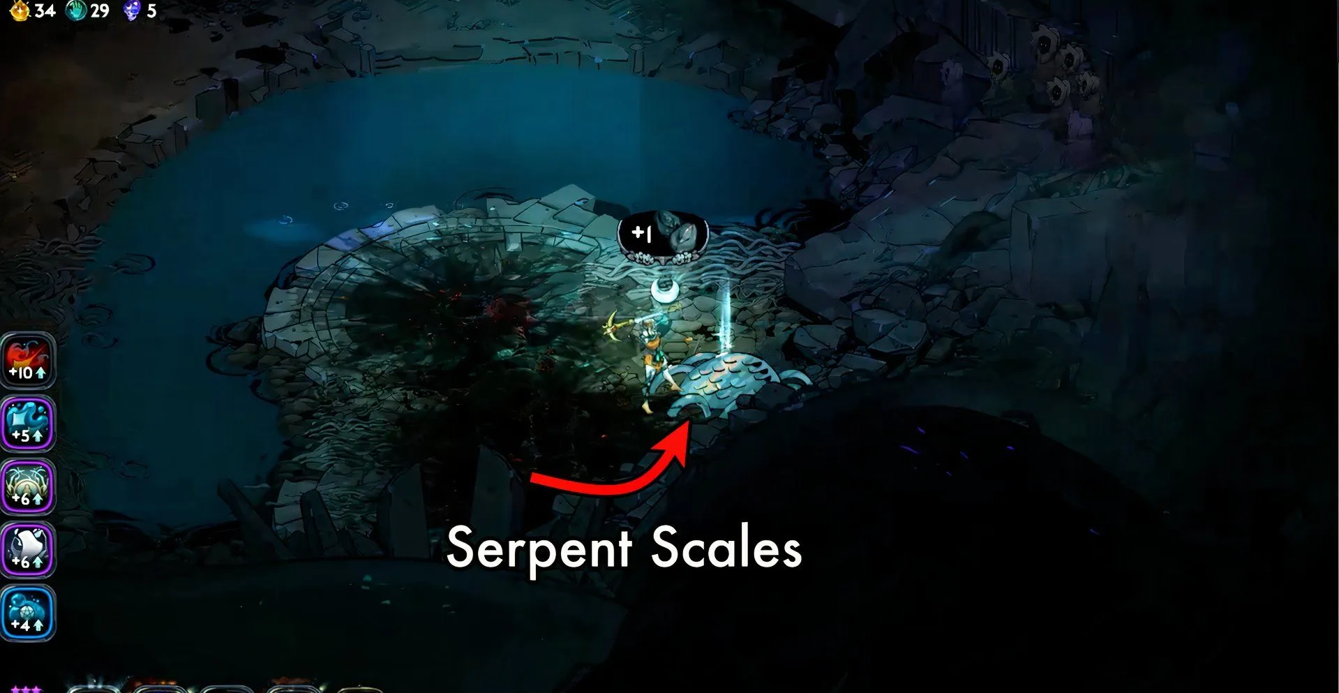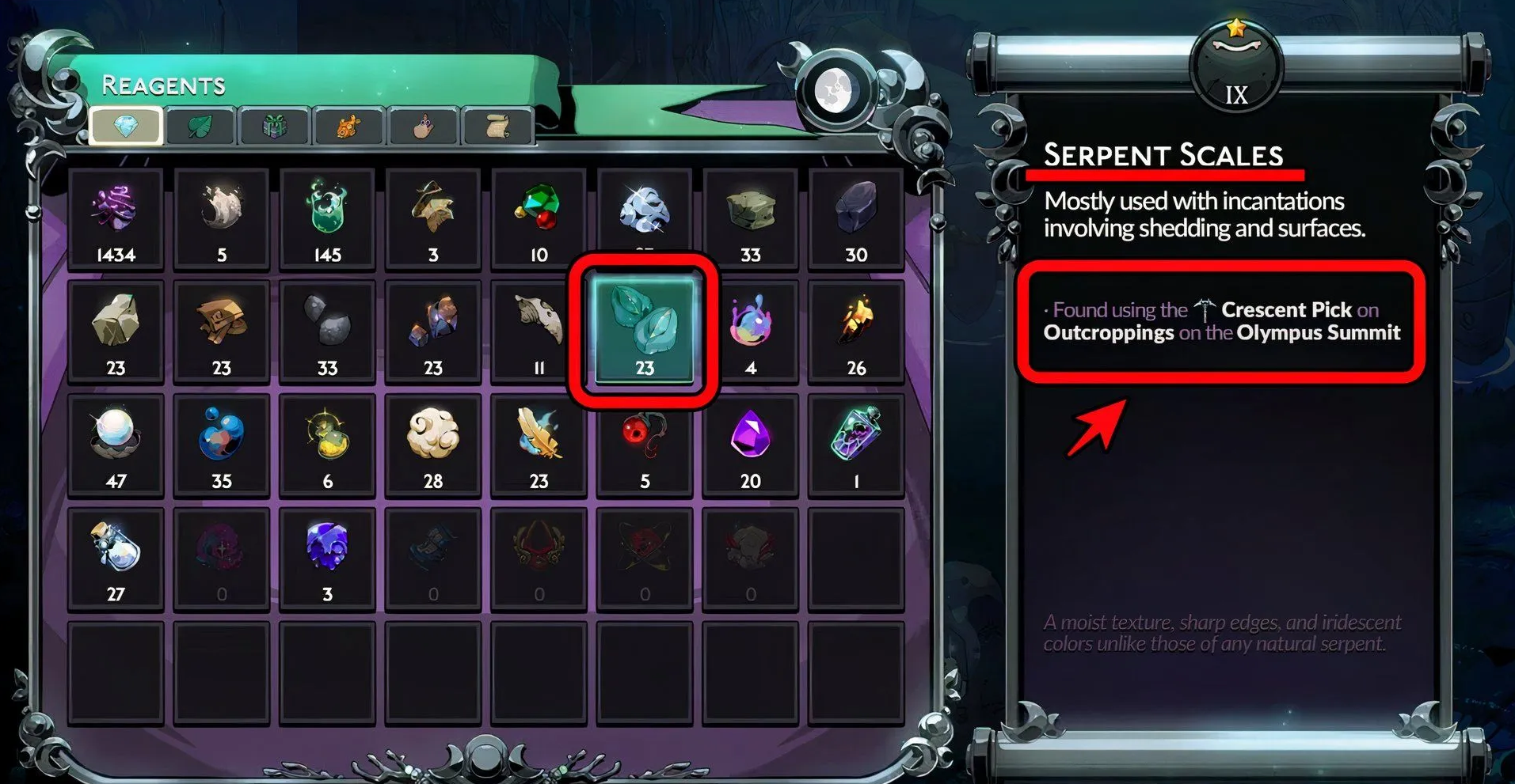 Для их добычи вам понадобится добраться до локации Вершина Олимпа, которая встречается лишь под конец забега. Змеиные чешуйки выглядят, как огромный зеленый валун, усеянный теми самыми чешуйками, вокруг которого проросли несколько ветвей или лоз. Ударьте это место несколько раз, чтобы получить необходимый ресурс. После этого можете использовать его в Перекрестке для создания новых заклинаний или для улучшения старых.