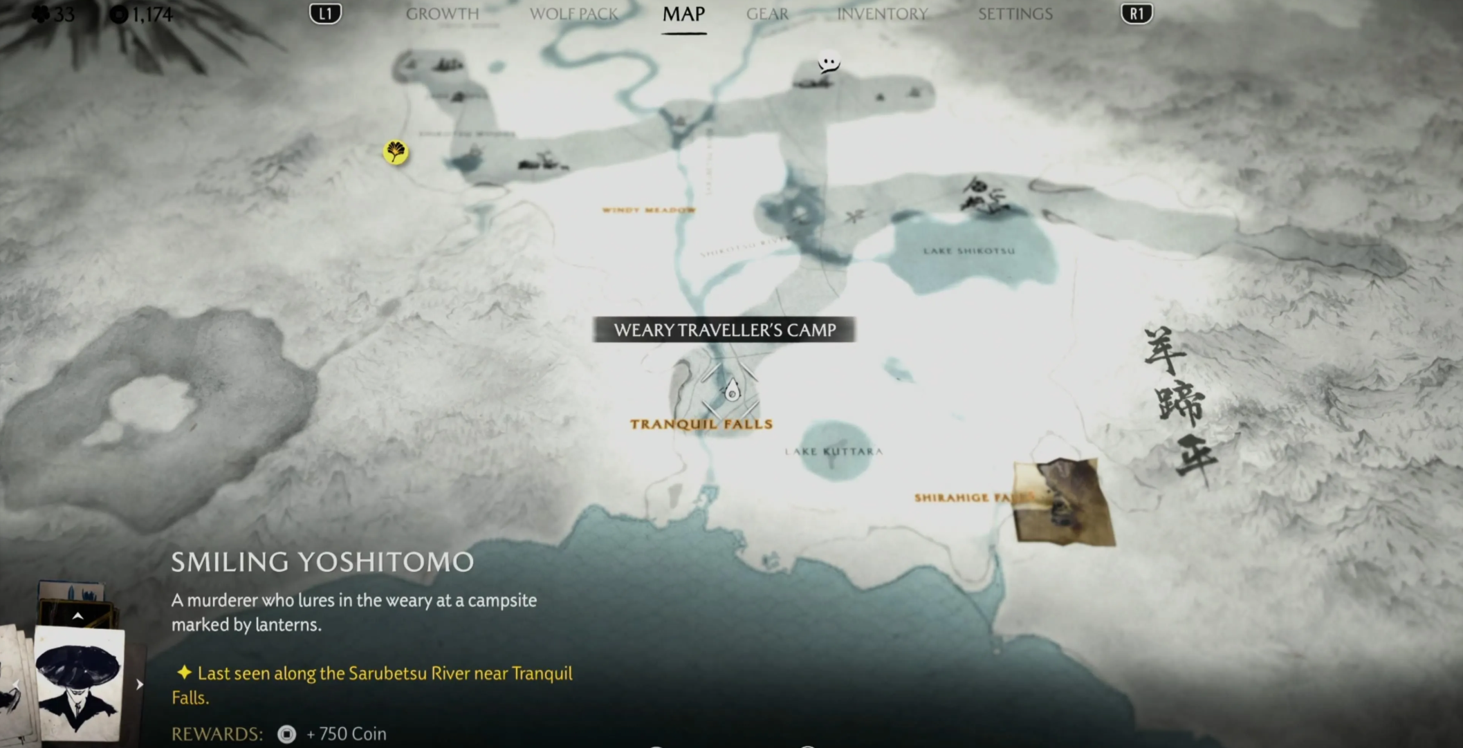 В самом начале игры, после того, как вы доберетесь до гостиницы, игра даст возможность ознакомиться с механикой охоты за головами, заказы на которую можно взять на специальной доске объявлений. Одной из первых целей для охоты стал Улыбающийся Йосимото. Чтобы найти его, отправляйтесь в Тихие водопады.
