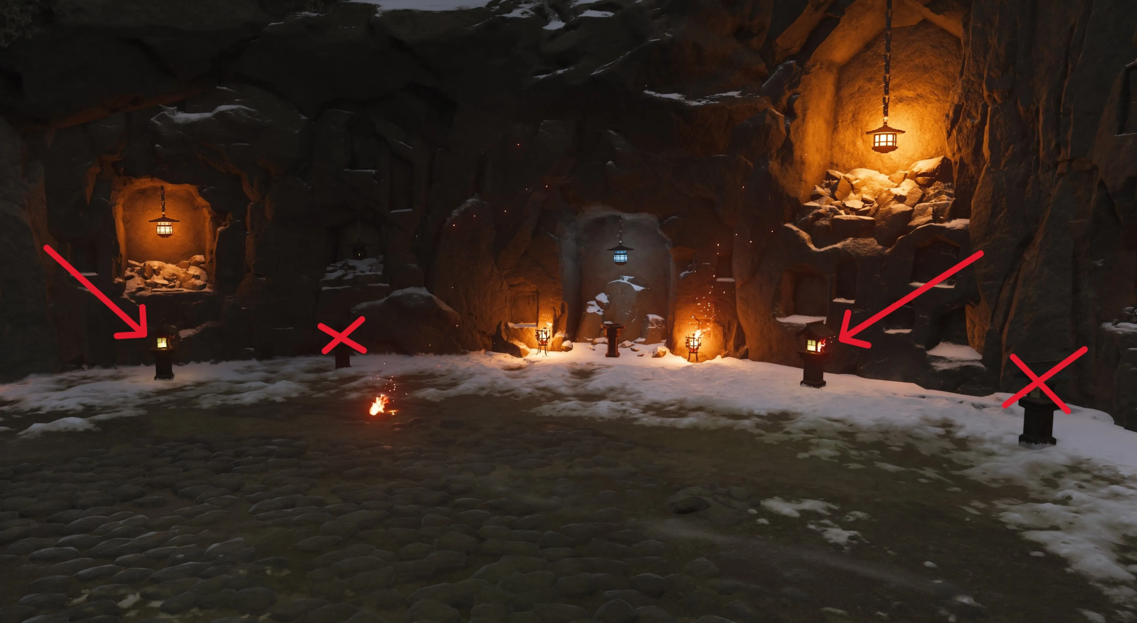 Загадка справа оказалась еще проще, ведь для ее решения нужно выбрать правильные фонари и зажечь их. Возьмите факел и подожгите его у кострища, а затем поместите огонь в следующие фонари: крайний левый и центральный правый.