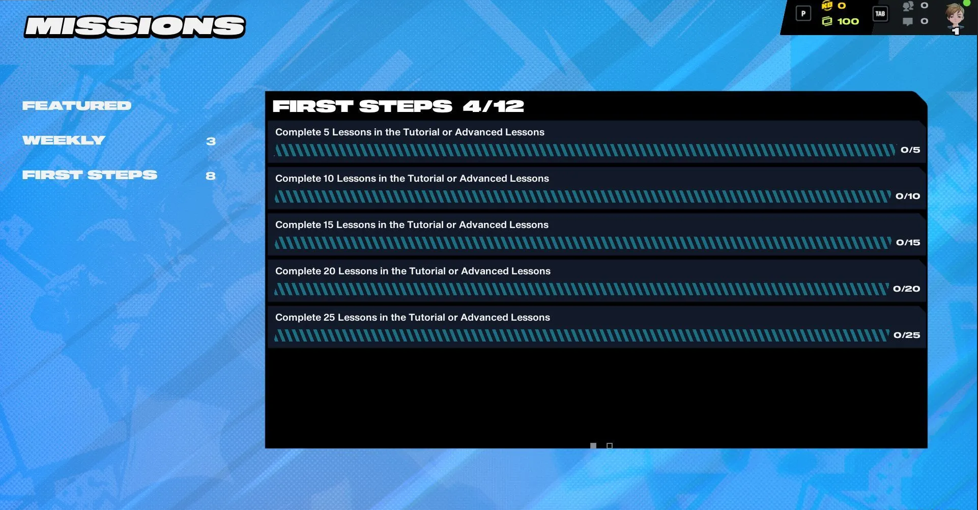 - Выполнить миссии «Первые шаги»