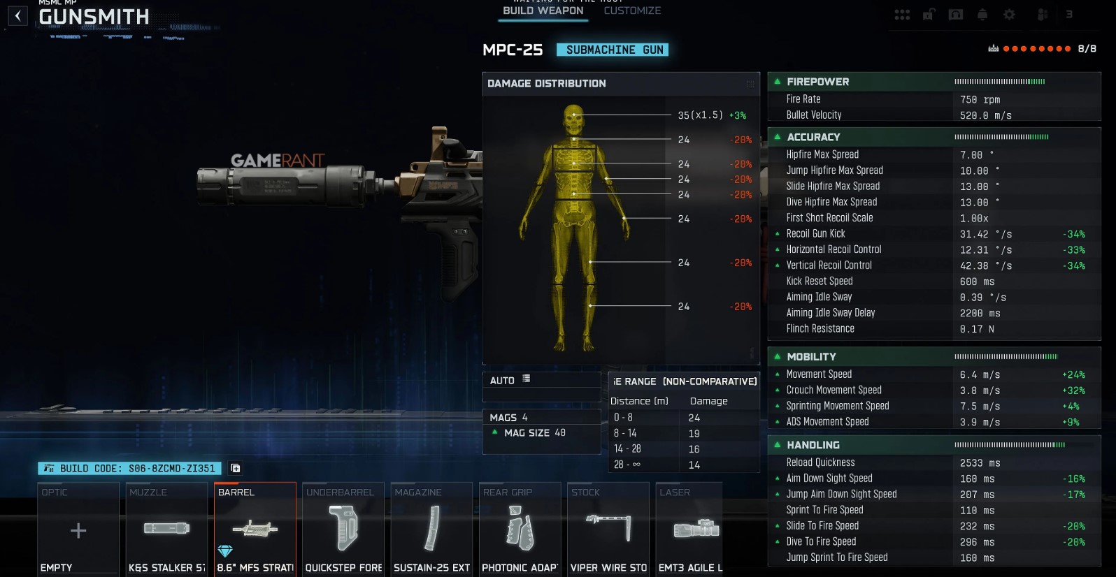 Ствол 8.6'' MFS Stratus-X — сердце этой сборки. Он не увеличивает урон в голову, как многие другие, а значительно снижает вертикальную и горизонтальную отдачу, улучшая стабилизацию. Хоть это и уменьшает урон по телу и скорость пули, MPC-24 с такими настройками становится идеальным для ближнего и среднего боя, особенно если вы целитесь в голову.