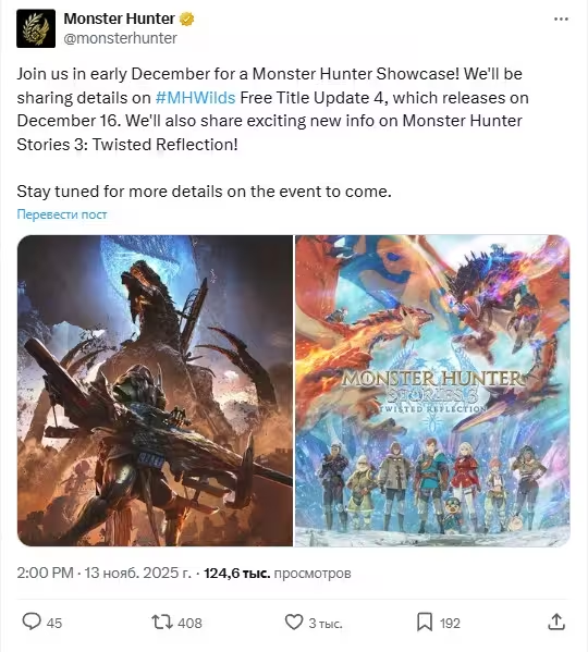 Издательство Capcom проведет в начале декабря трансляцию для поклонников серии Monster Hunter. Центральной темой станет четвертый апдейт для Wilds, который выйдет 16 декабря. Он добавит в игру монстра Гогмазиоса и улучшит производительность.