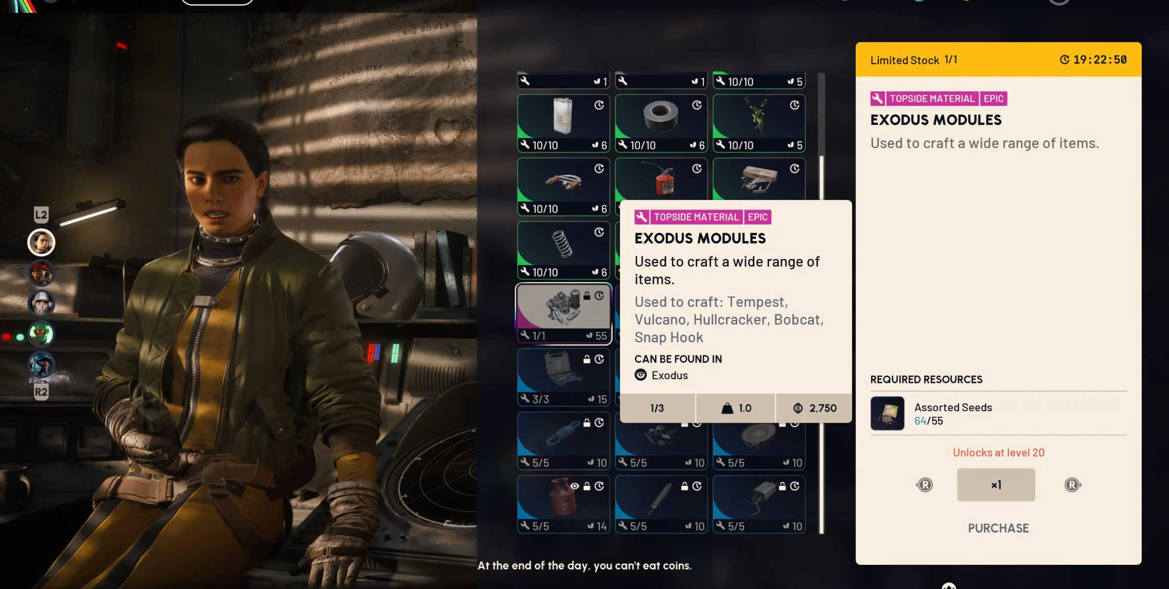 Модули исхода — достаточно редкий ресурс, необходимый для создания мощного снаряжения. Их можно найти в красных шкафчиках Сборочного цеха ракет на карте Космодром. Вы также можете прикупить этот ресурс у торговца по имени Селеста. Она отдаст вам один модуль за 55 разнообразных семян.