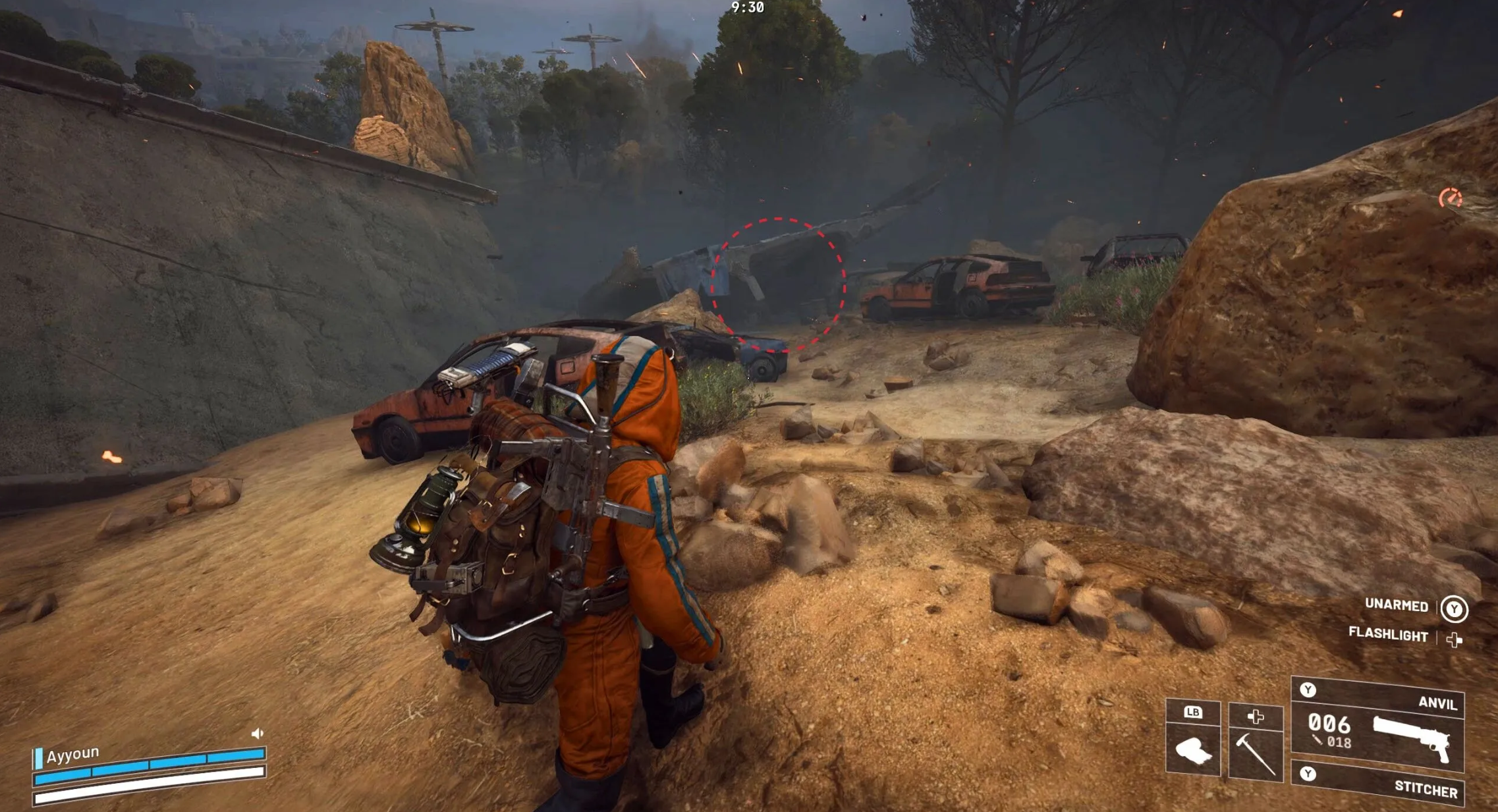 Добравшись до места, ищите обрушившуюся конструкцию шоссе с разбросанными машинами. Под ней вы заметите временное укрытие, обозначенное синим брезентом — оно и есть цель вашего путешествия. Пройдите внутрь этой импровизированной базы, чтобы найти заветный тайник.