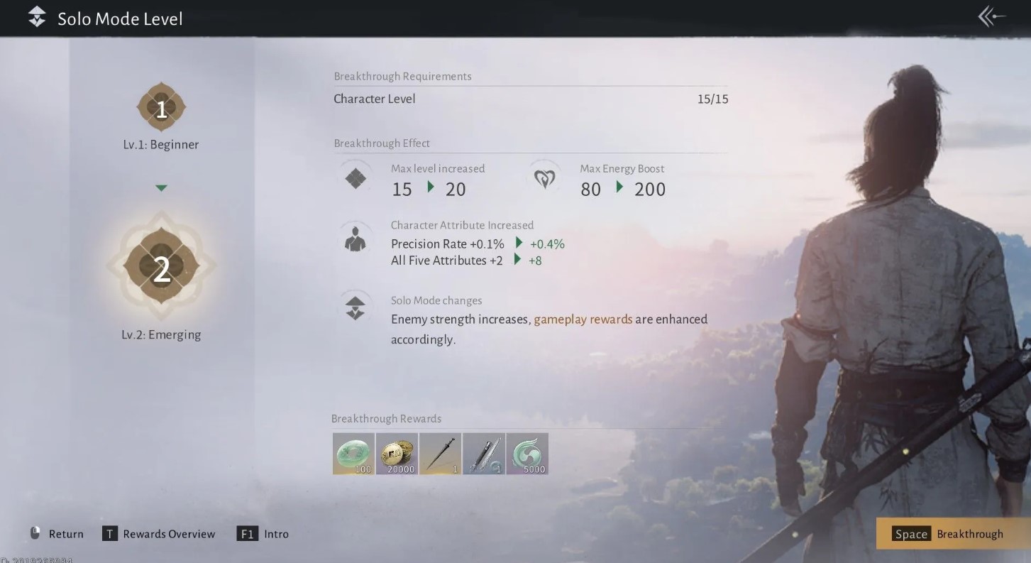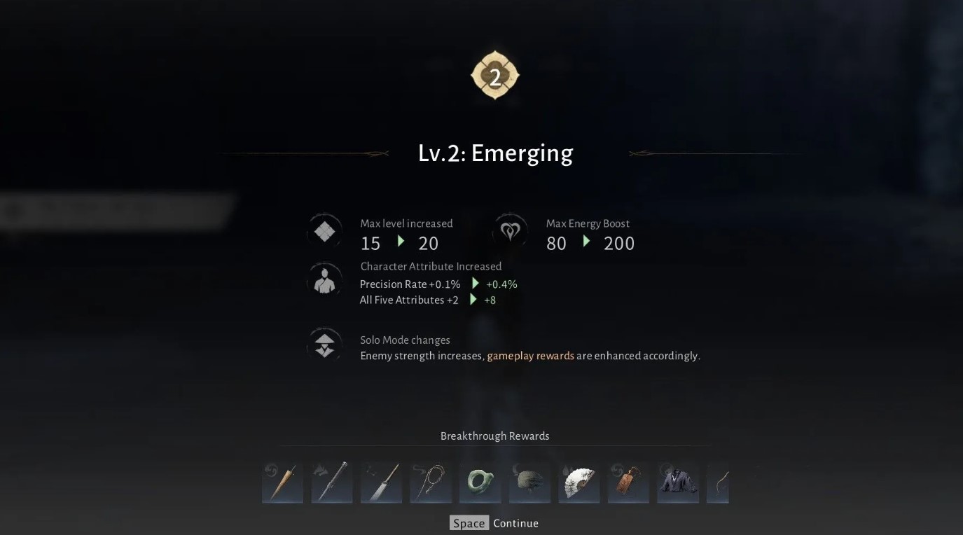 В Where Winds Meet существуют два типа уровней: одиночные, связанные с сюжетом, и социальные, относящиеся к мультиплееру. Достигнув определенного лимита в одиночном режиме, игрок проходит испытание прорыва, чтобы продолжить развитие. Социальные уровни повышаются автоматически, открывая доступ к групповым активностям, где ключевую роль играет Уровень боевых искусств.