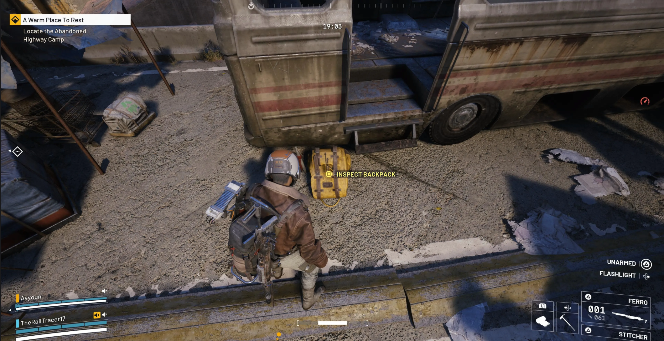 Здесь ваша цель — большой автобус, стоящий чуть выше отметки «шоссе» на карте. На его ступенях лежит рюкзак, с которым необходимо взаимодействовать.