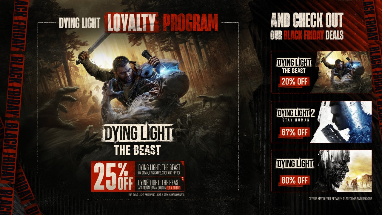 Компания Techland объявила о запуске специальной акции для обладателей Dying Light и ее сиквела. В период с 18 ноября по 2 декабря они смогут приобрести игру Dying Light: The Beast со скидкой 25%. Также им будет доступен купон на аналогичную скидку для друга.