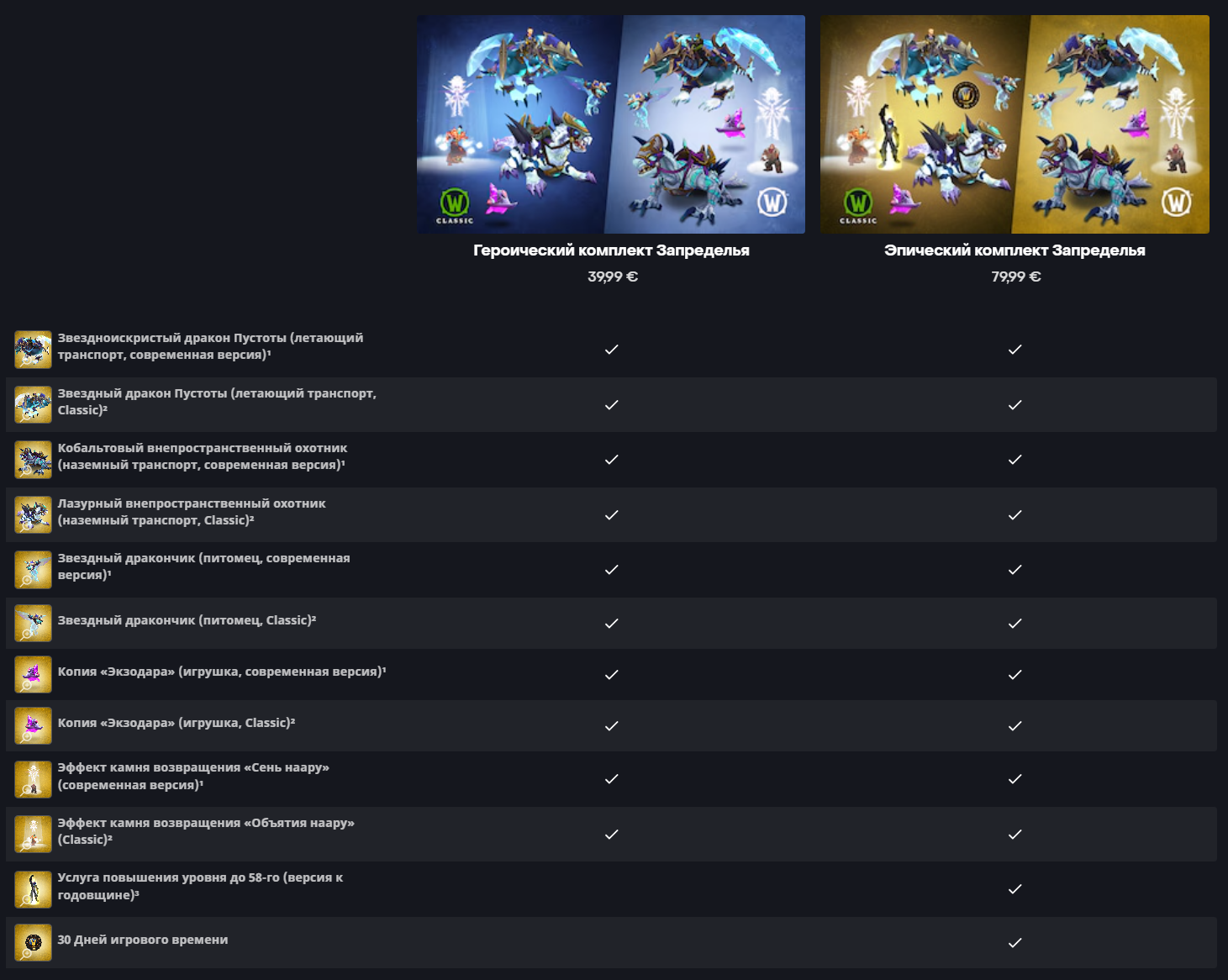 - Эпический комплект с содержимым героического набора и дополнительными бонусами