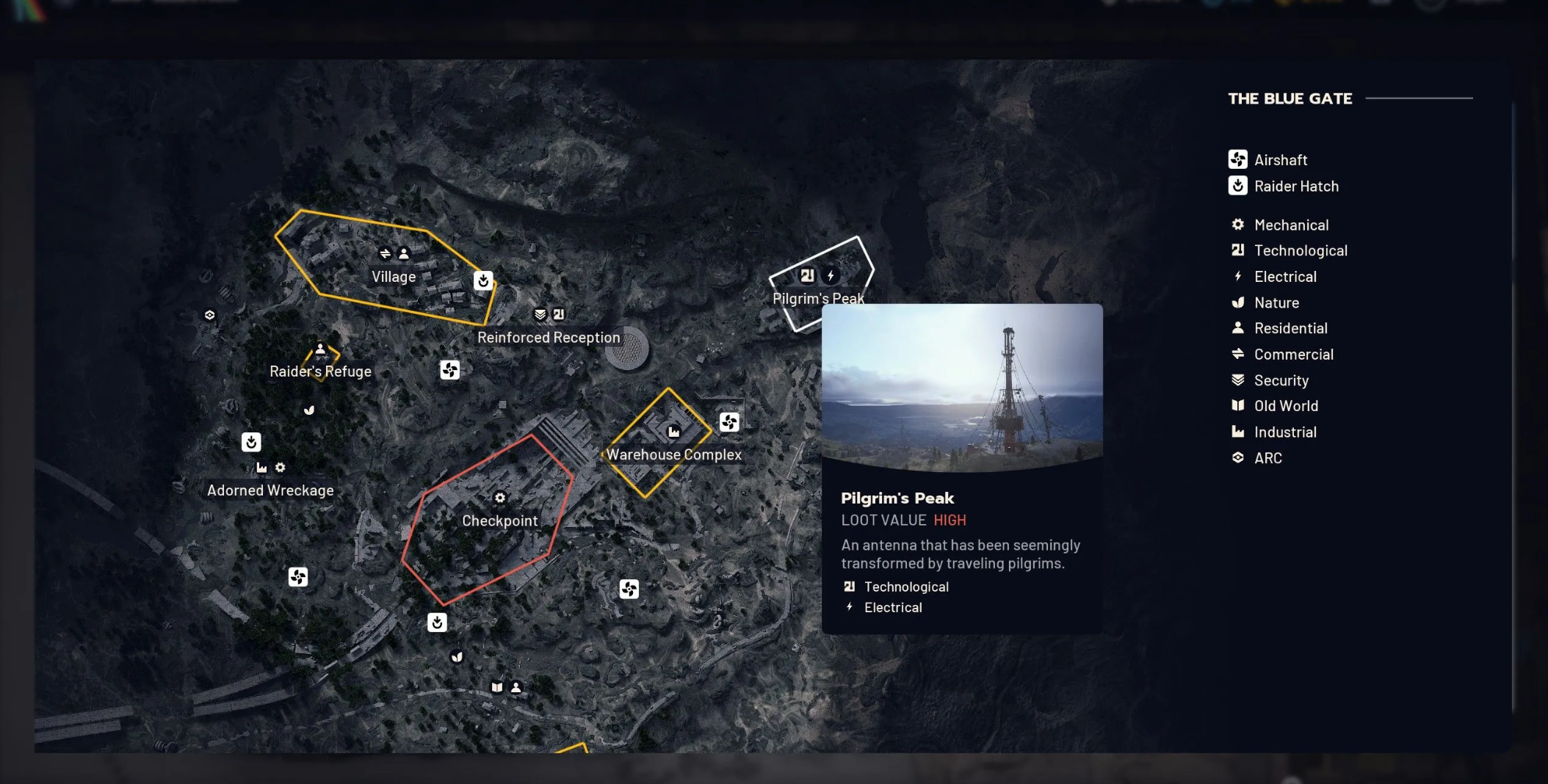 Самые продуктивные районы для добычи сенсоров, классифицируемых как охранные и технологические материалы, отмечены на карте шевроном или микросхемой: