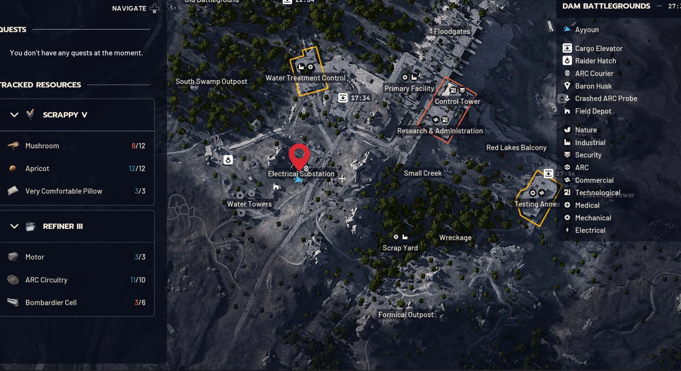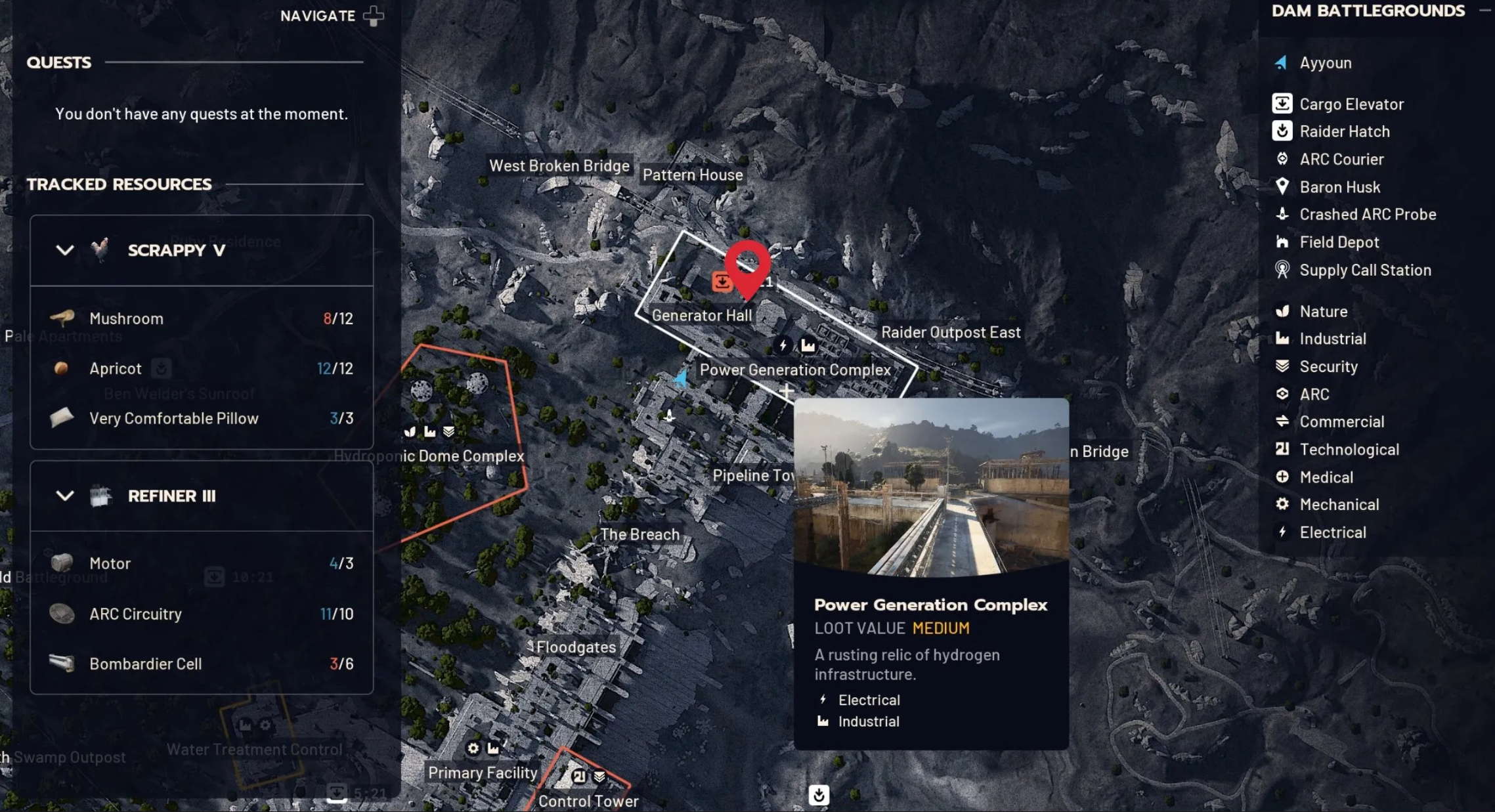 - Комплекс генерации энергии. Находится на севере карты. Эта территория более опасна из-за близости к зонам со средним лутом и постоянных патрулей Ракетчика. Однако, действуя оперативно, можно быстро забрать нужные предметы и скрыться. Ищите автомобиль, припаркованный рядом с автобусами к востоку от точки эвакуации «Лифт Северного комплекса». Взломав капот, вы найдете там несколько лампочек. Обязательно поместите их в «Безопасный карман» перед уходом