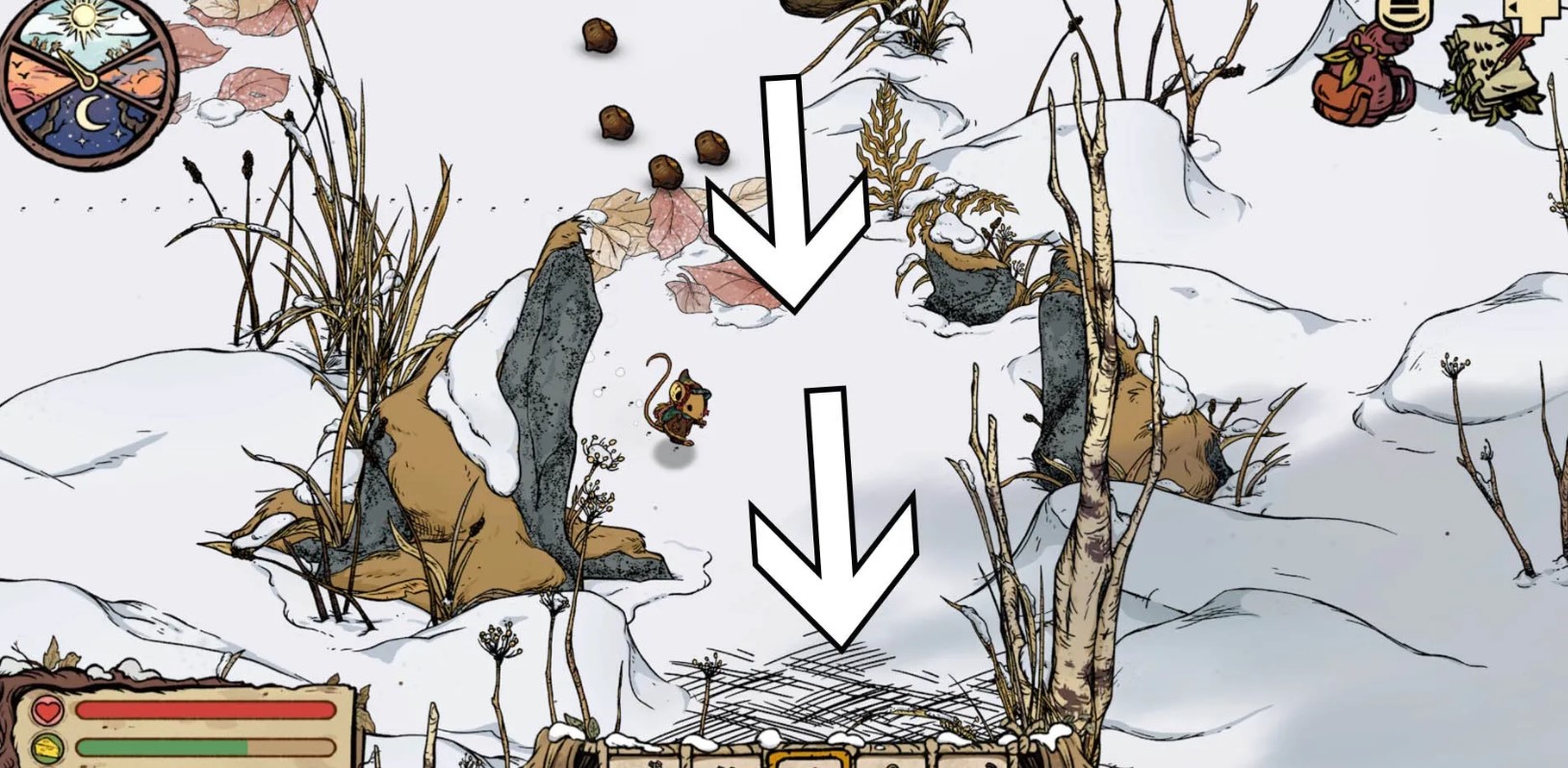 Оказавшись в новой местности, двигайтесь вдоль нижнего края экрана, смещаясь вправо. Ваша цель — обнаружить узкий проход, образованный двумя массивными каменными столбами, ведущий на юг. Возле него вы заметите лесной орех.