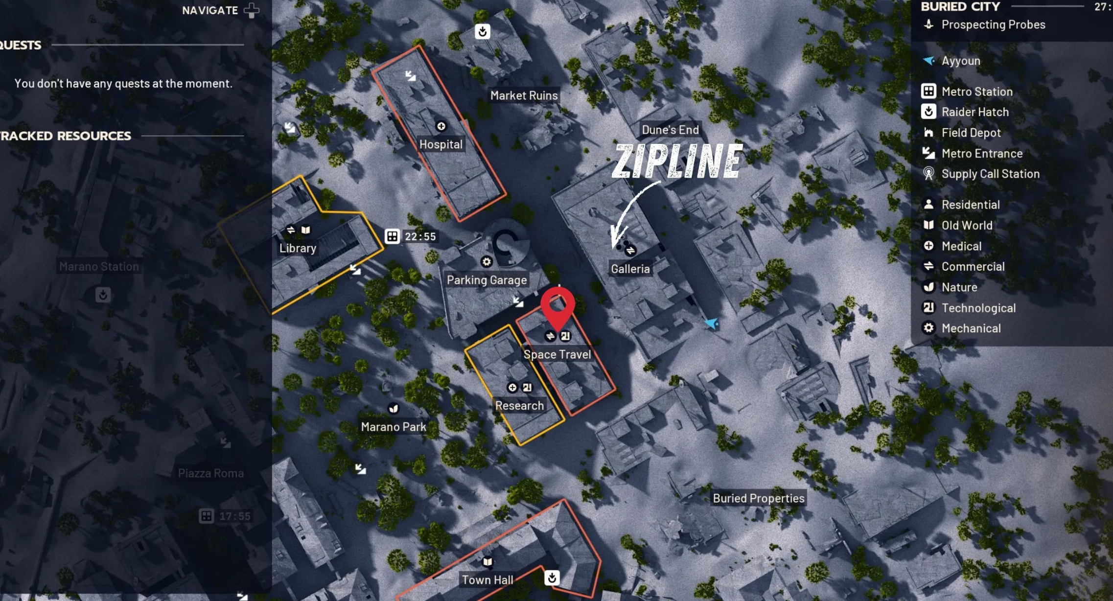 Самый безопасный маршрут пролегает через крыши. Здание Galleria расположено восточнее вашей цели, и подняться на него не составит труда. Оттуда переправьтесь на Space Travel по натянутому тросу.