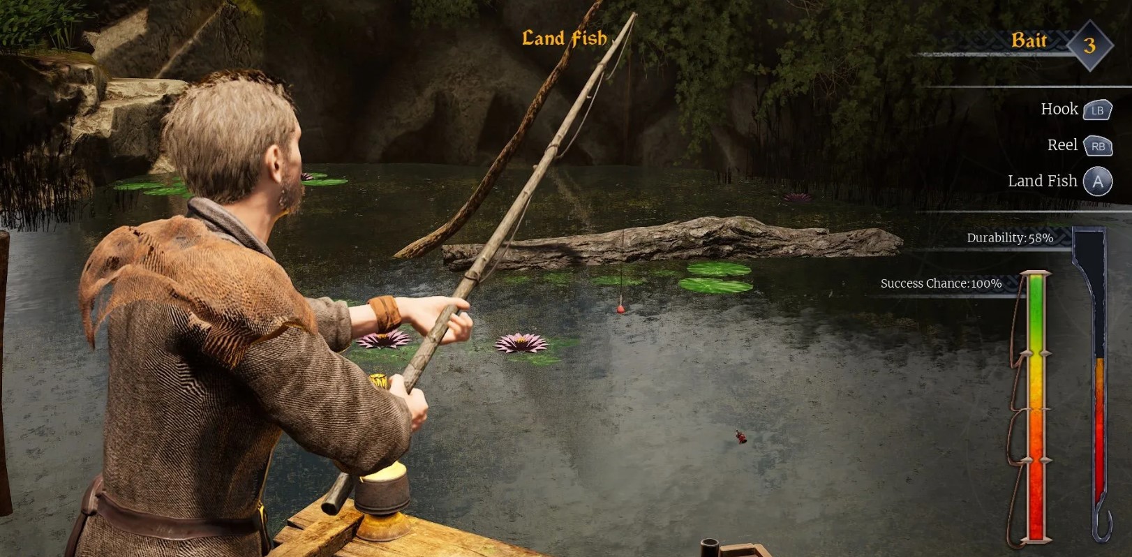 Успех зависит от таймингов. Внимательно слушайте окружение: как только раздастся звук «плюх», делайте одиночное нажатие для подсечки. Когда леска начнет натягиваться, удерживайте кнопку подмотки.