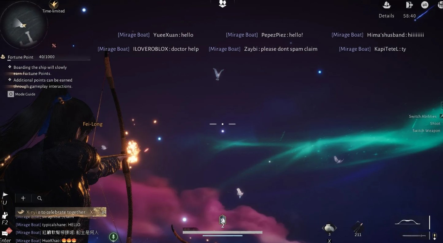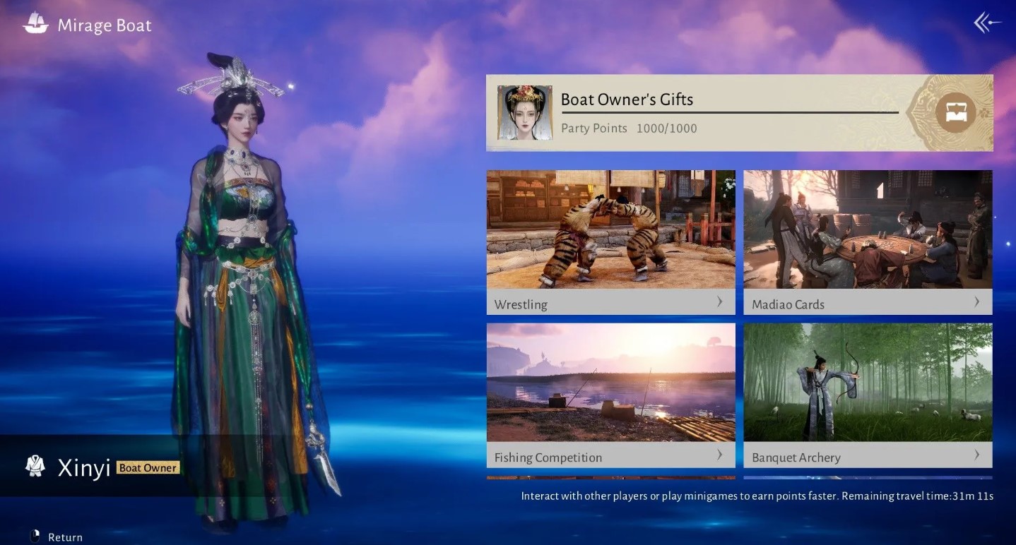 Для участия необходимо открыть регион Кайфэн и завершить вводный квест «Цинхэ». Ищите иконку золотого воробья в интерфейсе в воскресенье вечером или утром понедельника, телепортируйтесь на судно и наберите 1000 очков удачи в мини-играх, чтобы получить подарок от владельца корабля.