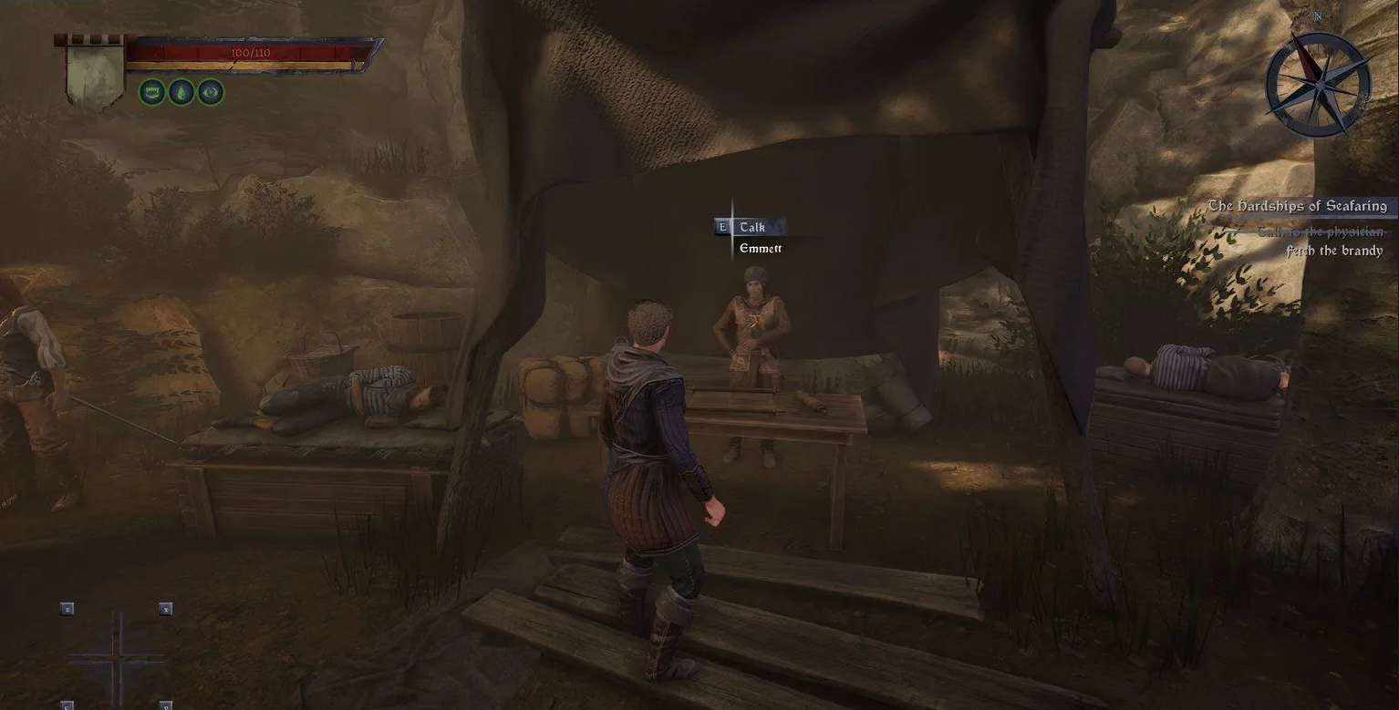 Врач не отмечен на карте, но лагерь достаточно компактен, поэтому долгие поиски не потребуются. Двигайтесь по тропинке за спиной Сирдара или обойдите стоянку по периметру, пока не увидите небольшую палатку, окруженную светящимися грибами. Эмметт согласится помочь, если вы принесете ему спиртное для раненых из запертого ящика.