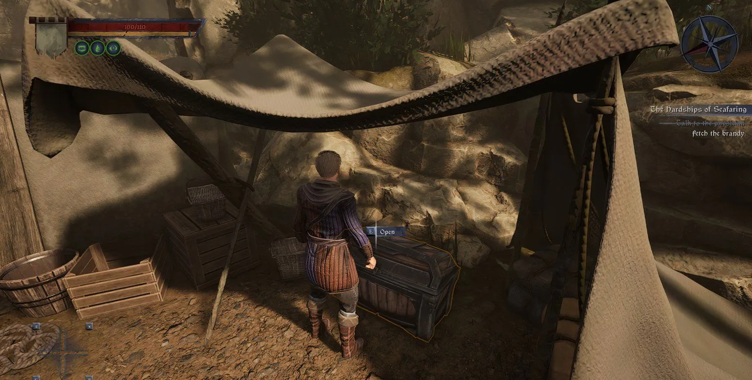 Для завершения миссии поговорите с Сирдаром на берегу, затем отыщите врача Эмметта в палатке у светящихся грибов. Получив ключ, откройте сундук под навесом на стартовой точке, заберите припасы и отдайте одну бутылку лекарю, после чего доложите об успехе квестодателю для повышения характеристик.
