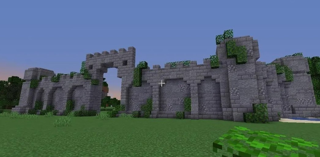 Для внешнего ограждения базы или разделения зон лучше всего подходит стиль фэнтезийного замка. Ключевая особенность здесь — симбиоз архитектуры и природы, когда камень кажется естественным продолжением ландшафта: