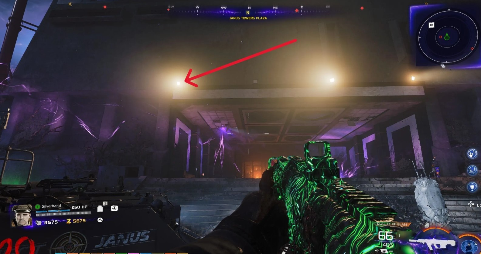 После завершения облета выживайте на протяжении четырех волн. Затем направляйтесь в холл Janus Towers Plaza и обратите внимание на освещение с северной стороны. Крайняя лампа слева начнет мигать, передавая код из цифр от 1 до 7.