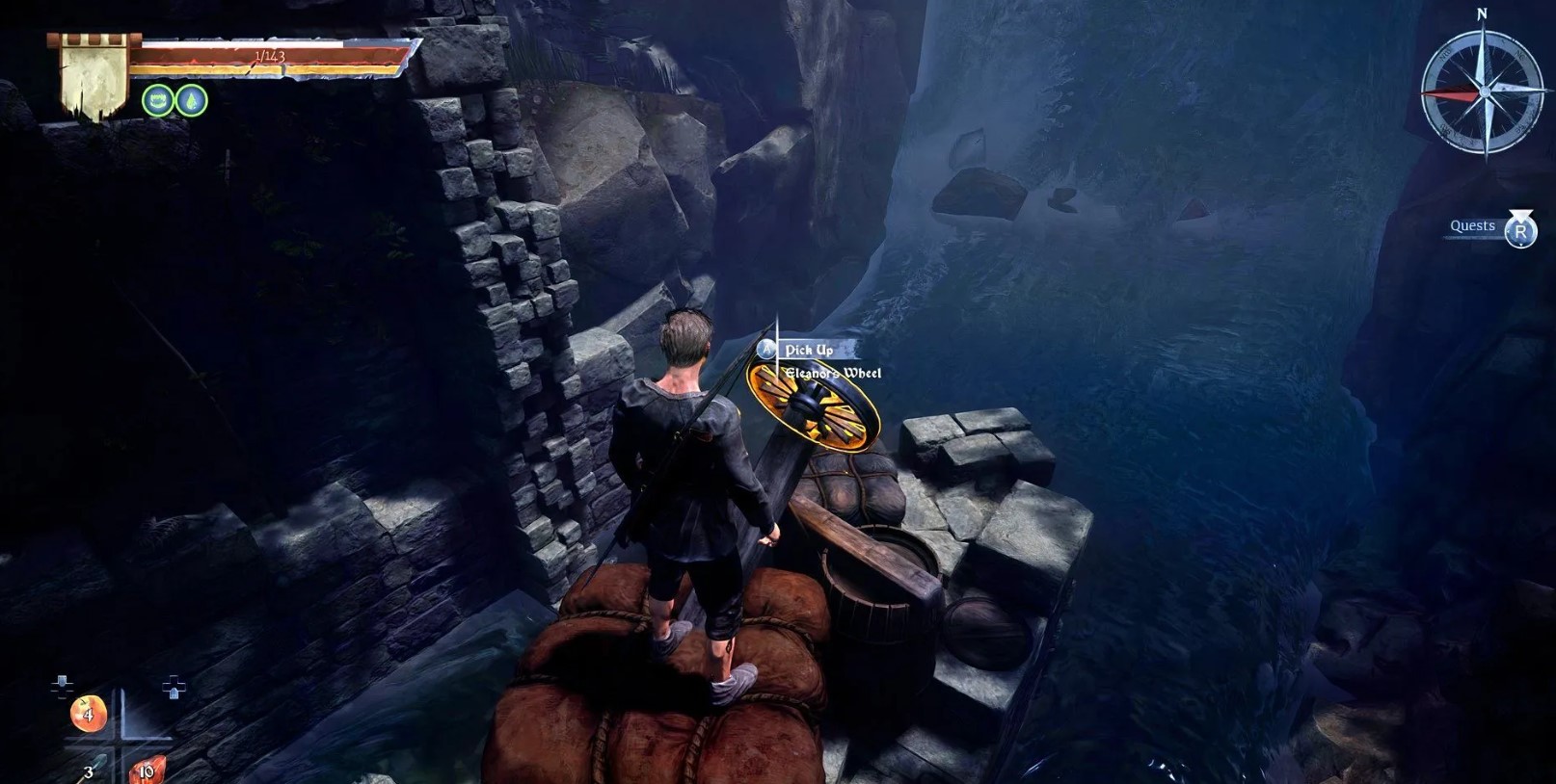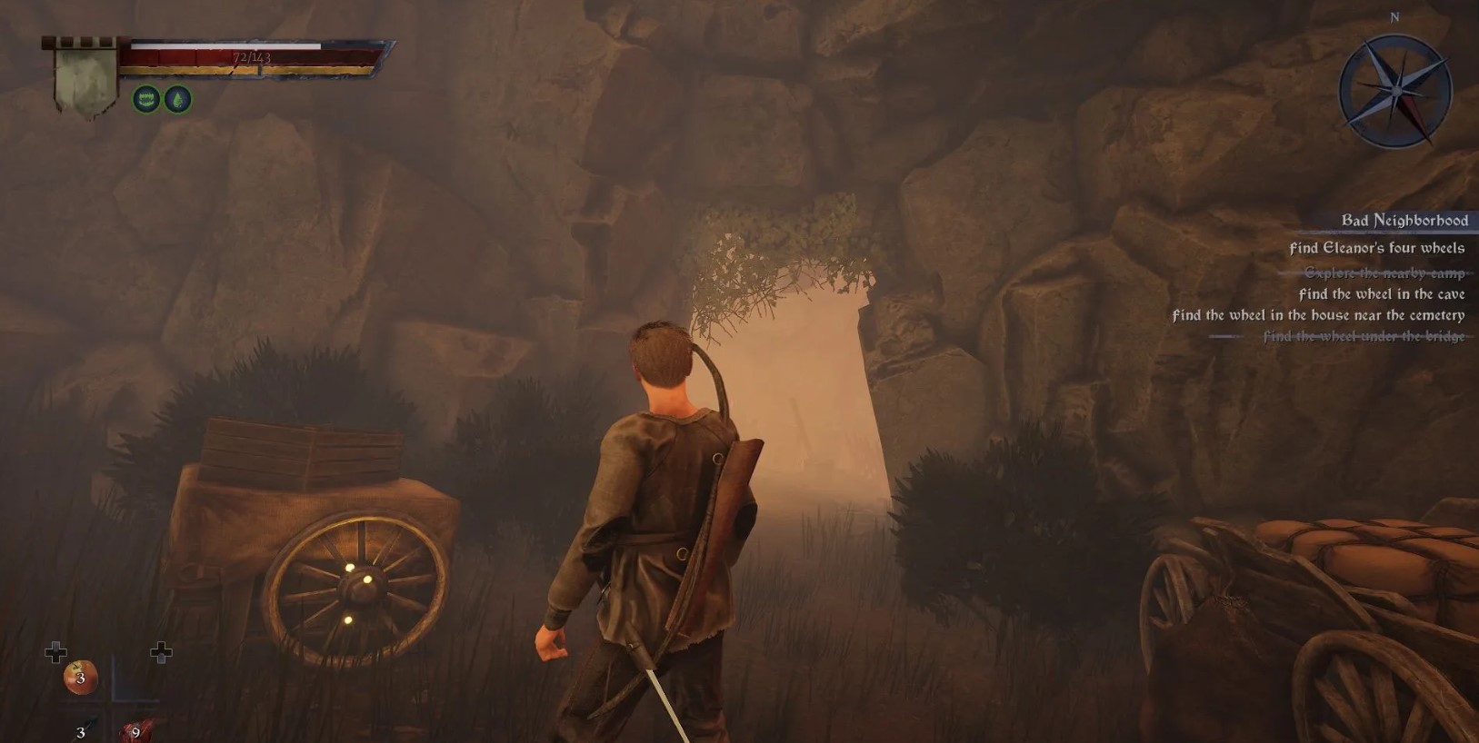 Вам предстоит исследовать окрестности стартовой локации и собрать четыре предмета: под мостом, в лагере врагов, у пещеры и в хижине отшельника. Для получения последнего колеса заранее купите у квестодателя ржаное вино, чтобы обменять его на деталь повозки.
