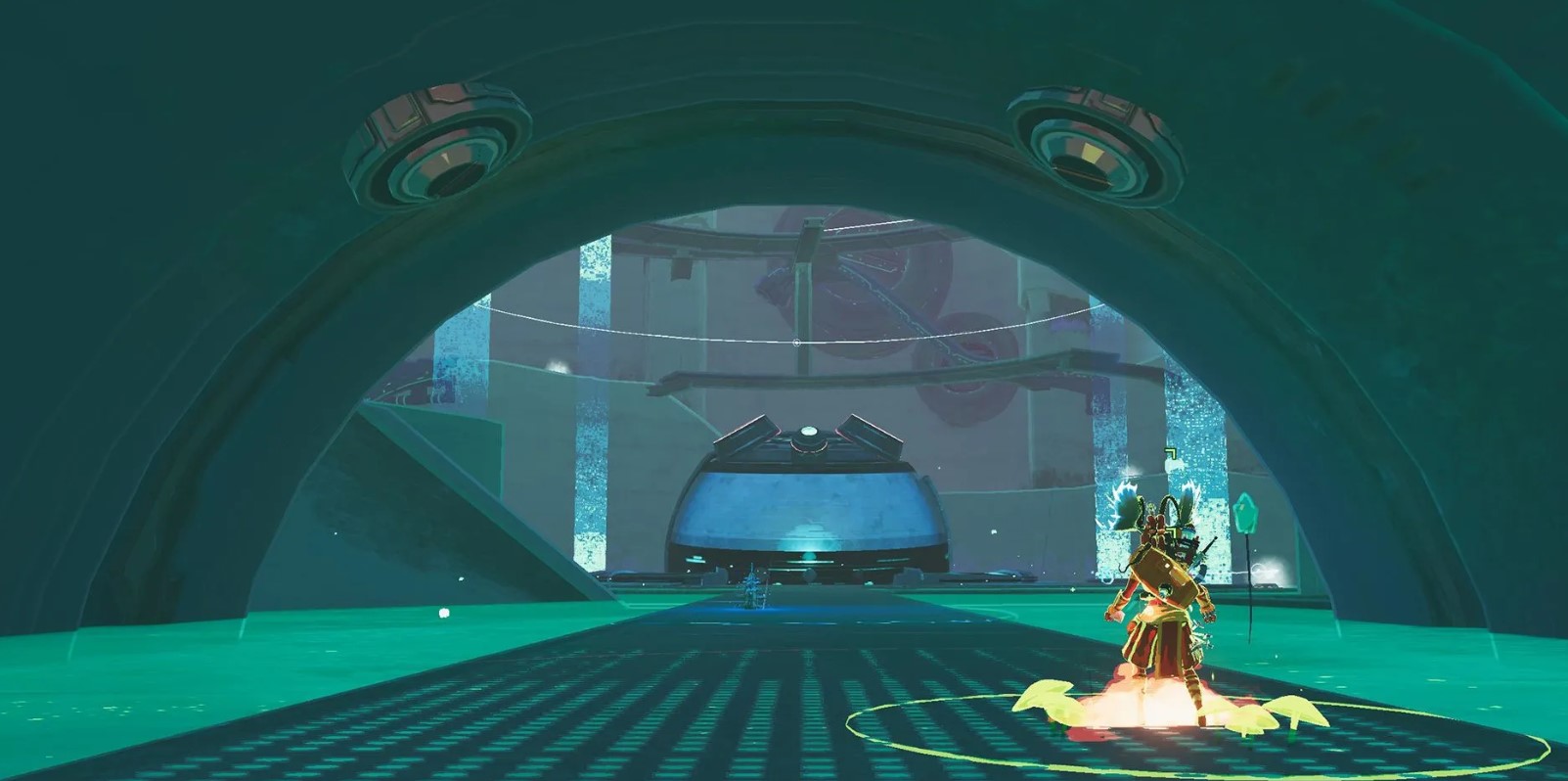 Взаимодействие с объектом приведет к появлению Виртуального портала после завершения события с основным телепортером уровня. Прыгайте в него, чтобы переместиться в Ущелье Проводника. Здесь вашей задачей станет сбор Ключей безопасности для активации перехода и сражение с Охотником за сплавами.