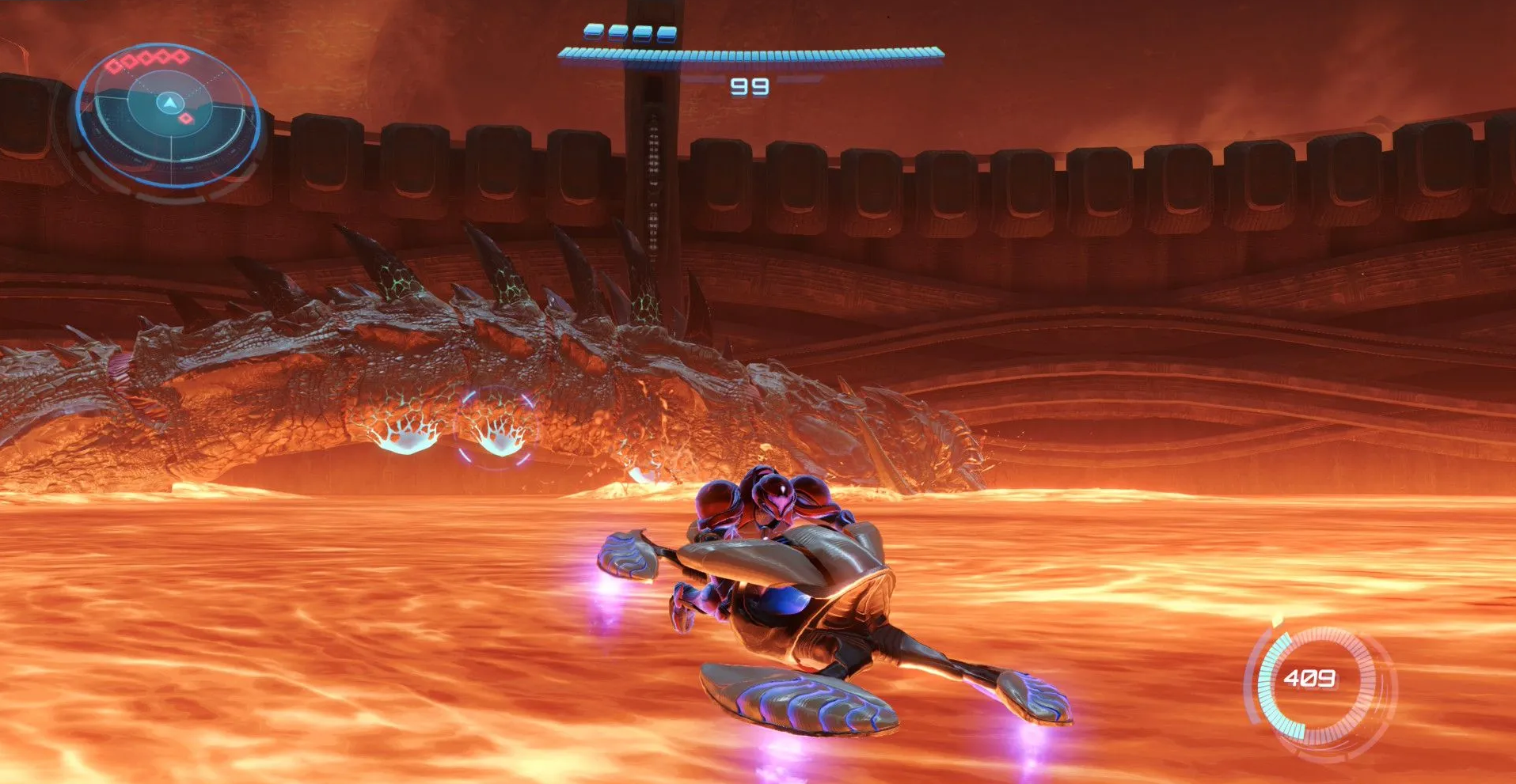 Сначала расстреливайте бирюзовые наросты на брюхе змея, маневрируя на байке между гейзерами лавы. Во второй фазе переключитесь на Ледяной выстрел, чтобы сбивать уязвимые точки на голове и оглушать противника. Наносите основной урон по языку Ракетами, а финальный удар направьте Пси-лучом прямо в глотку поверженного монстра.
