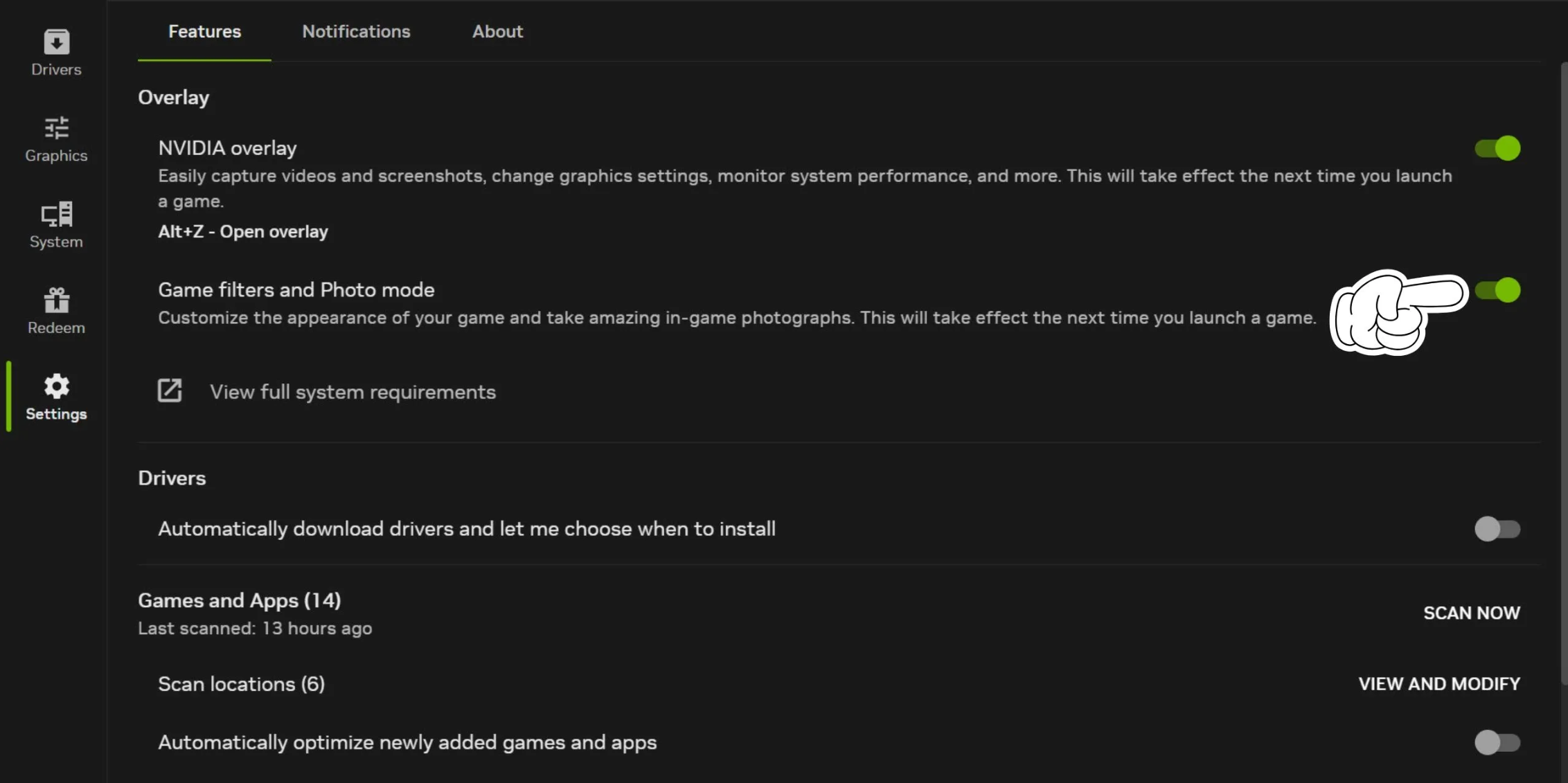 Разработчики не добавили штатных средств для регулировки яркости, поэтому придется использовать драйвер видеокарты. Запустите приложение Nvidia App, которое заменило старый GeForce Experience, перейдите во вкладку настроек и в блоке «Наложение» активируйте опцию игровых фильтров.