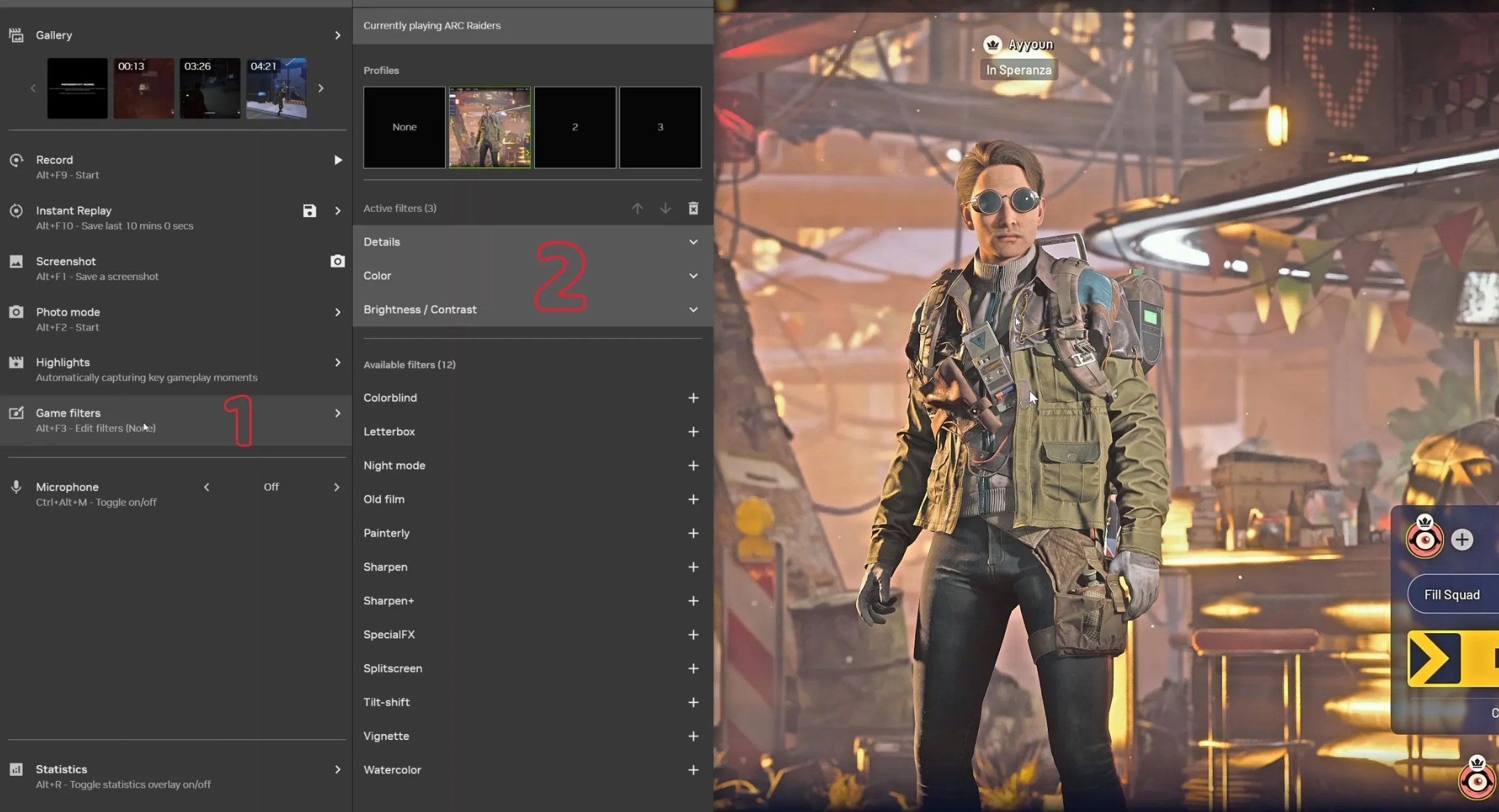 Включите функцию наложения в настройках Nvidia App, зайдите в игру и откройте оверлей клавишами Alt+Z. Добавьте фильтры «Детализация», «Цвет» и «Яркость», выставив параметры так, чтобы компенсировать затемнение теней и повысить общую четкость изображения.