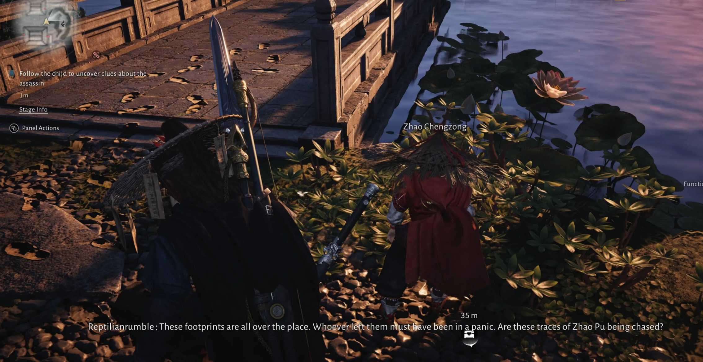 Отправляйтесь в район Процветающей Гавани и подслушайте разговор у Пограничного камня, чтобы открыть доступ к резиденции Чжао Пу. Проникните в поместье через пролом, следуйте за мальчиком Чжао Чэнцзуном и решайте пространственные загадки с размещением оружия в нишах, чтобы добраться до финальной награды в подземелье.