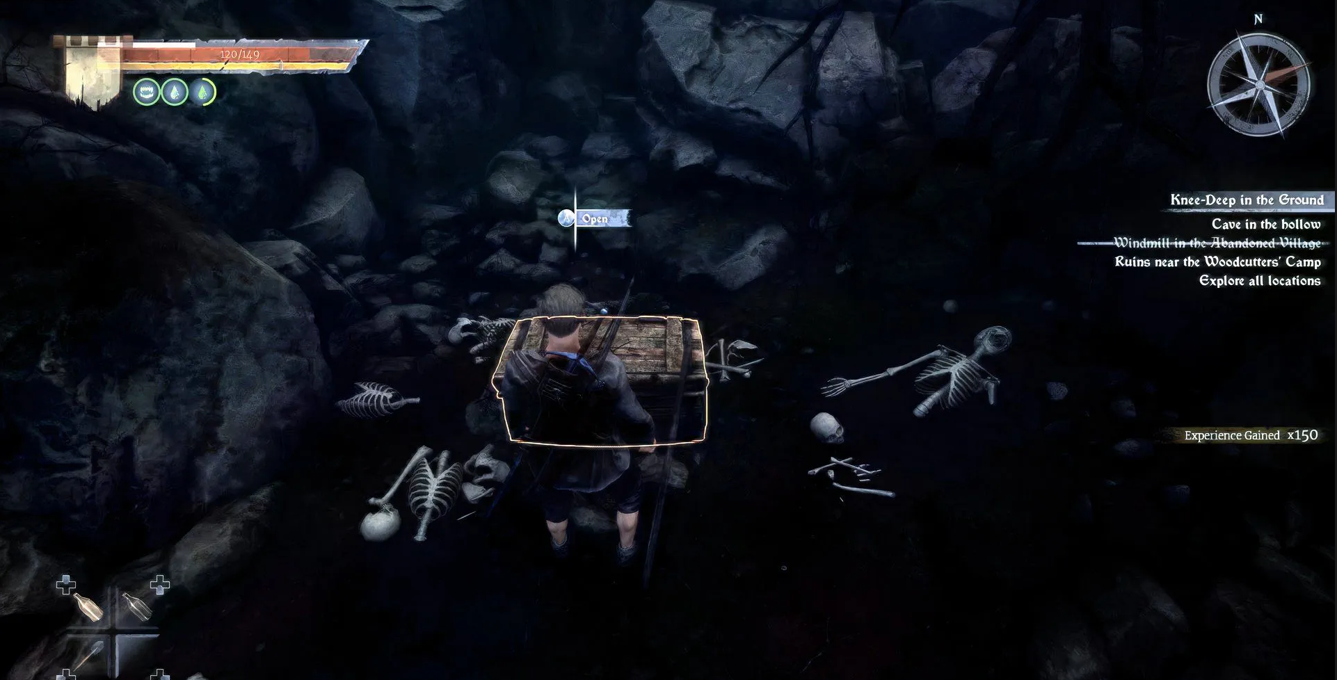 Отыщите NPC по имени Микс в руинах слева от стартовой локации и обязательно запаситесь тремя лопатами. Вам предстоит посетить пещеру в низине, территорию за ветряной мельницей и развалины у лагеря лесорубов, чтобы выкопать спрятанные сундуки с золотом и припасами.