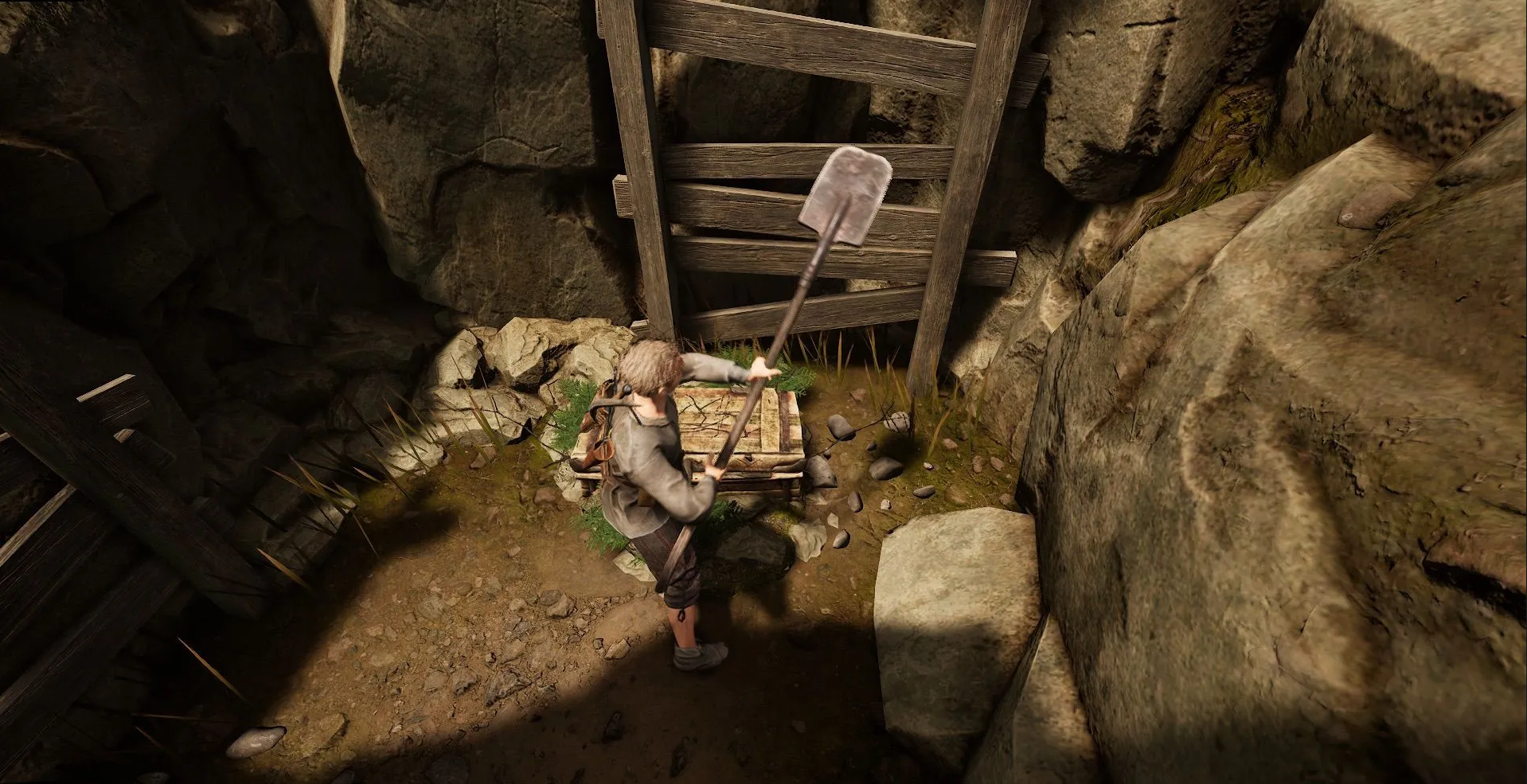Перед началом пути тщательно обыщите дом Нереста и все встречные лагеря, чтобы собрать необходимый инвентарь — лопаты. Затем двигайтесь прямо от жилища, минуйте большую лужу и сверните влево. Заказчик стоит у каменной стены среди развалин.