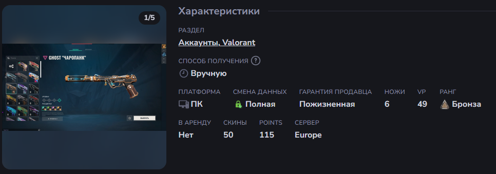 При покупке аккаунта в Valorant вы получаете доступ к обширной коллекции скинов, часть из которых уже никак не получить. Ценник учетной записи, в основном, зависит от количества скинов на аккаунте или от наличия эксклюзивных предметов.