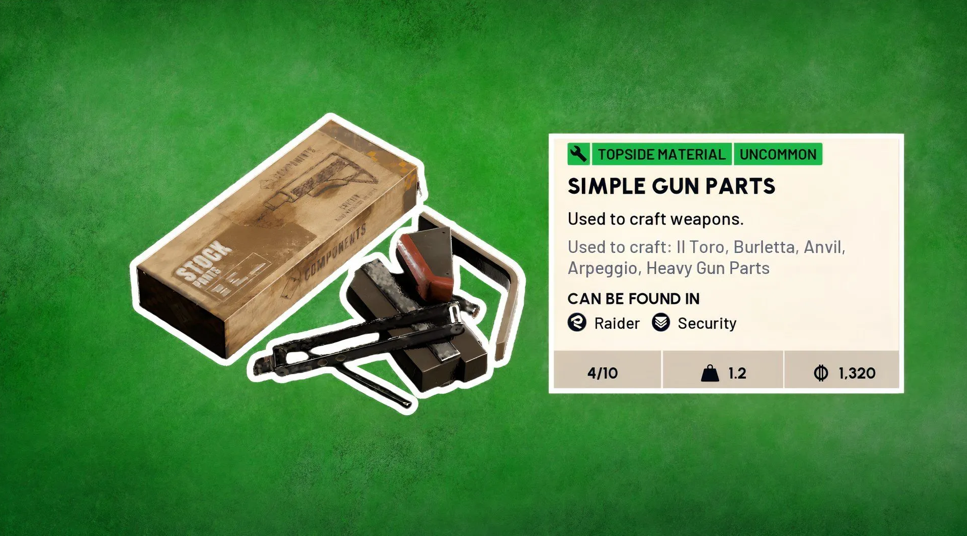 Простые детали можно добыть не только из ящиков, но и альтернативными методами. Самый доступный вариант — переработка вооружения моделей Stitcher, IL Torro, Kettle, Anvil, Burletta, Ferro и Hairpin. Также сгодится сломанное снаряжение или деконструкция более редких запчастей низшего ранга.