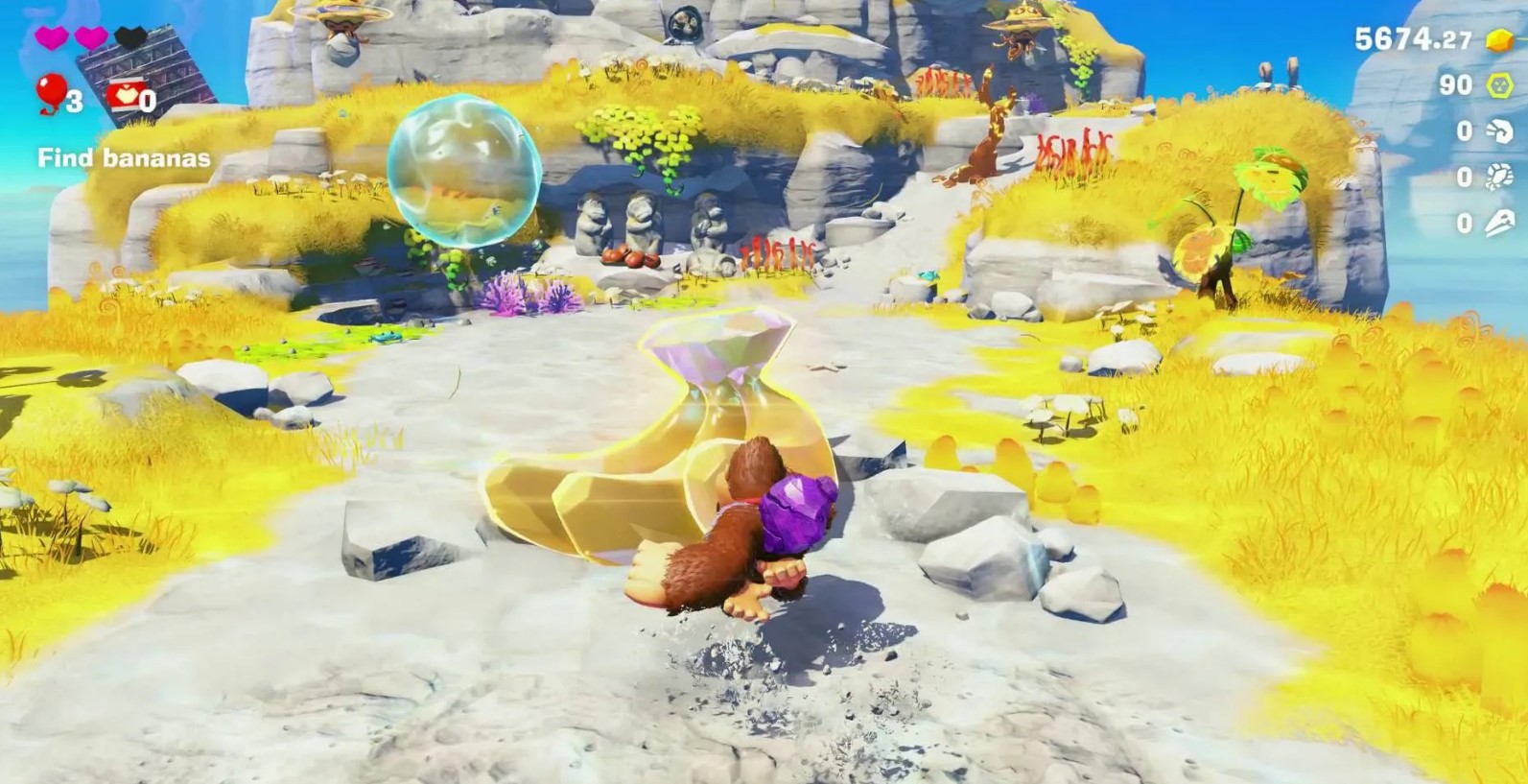 Всего в мире спрятано около 800 бананов. Многие находятся на уровнях-испытаниях вроде «Дороги на крыше» или «Страны ностальгии». Накопленные очки можно тратить на умения, а если выбор окажется неудачным — сбросить прогресс и перераспределить характеристики. В кооперативном режиме на Switch 1 второй участник управляет Полин, но ее роль ограничена пассивной поддержкой.