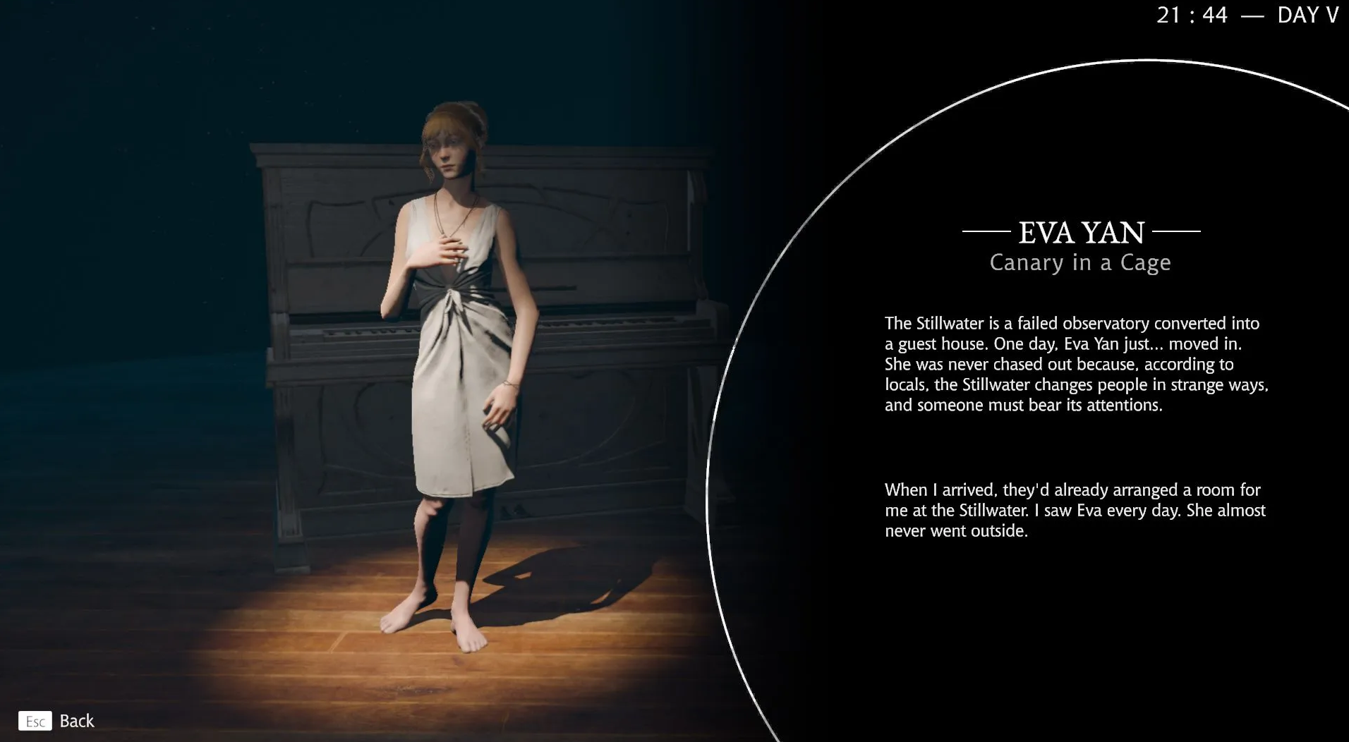 Вместо окончательного конца игры Бакалавр окажется в странной зеркальной комнате. Пообщайтесь с находящейся там тенью и следуйте ее инструкциям для возвращения в мир живых. Персонаж очнется в гостевом доме «Тихая заводь». Сразу же поднимайтесь по лестнице к Еве — именно этот разговор активирует мистическое свойство часов.