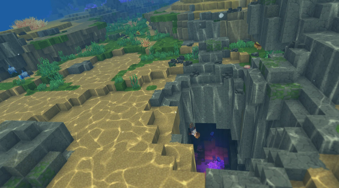 Обнаружение входа требует внимательности, так как локации генерируются случайно у побережий или островов. Ориентиром служит стена из воды темного оттенка. Это не просто текстура, а функциональное течение, позволяющее персонажу спускаться и подниматься.