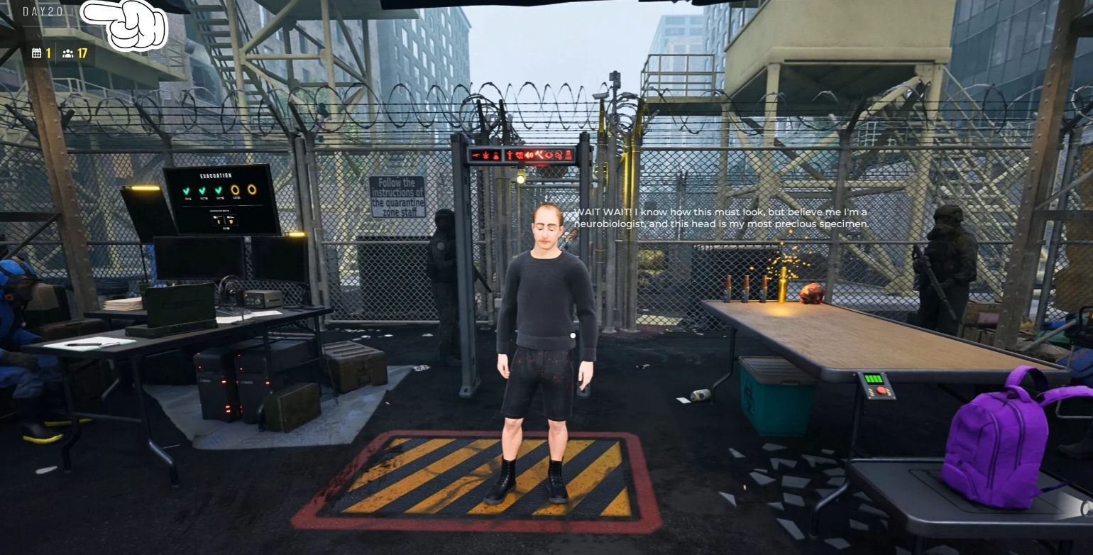 На двадцатый день найдите в очереди человека с головой мертвеца и золотой газировкой в сумке. Поселите его в жилой блок и соберите для него четыре фрагмента тел у других посетителей, игнорируя штрафы. После передачи предметов зачистите сектор от обратившихся в зомби людей.