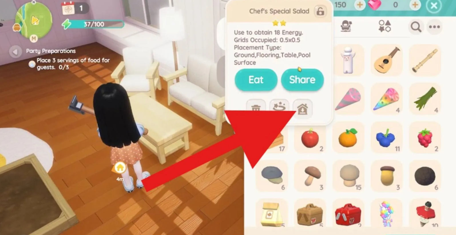 В вашем рюкзаке по умолчанию находятся салаты, идеально подходящие для решения этой задачи. Главная ошибка заключается в попытке нажать кнопки «Съесть» или «Поделиться», которые не позволяют декорировать помещение.