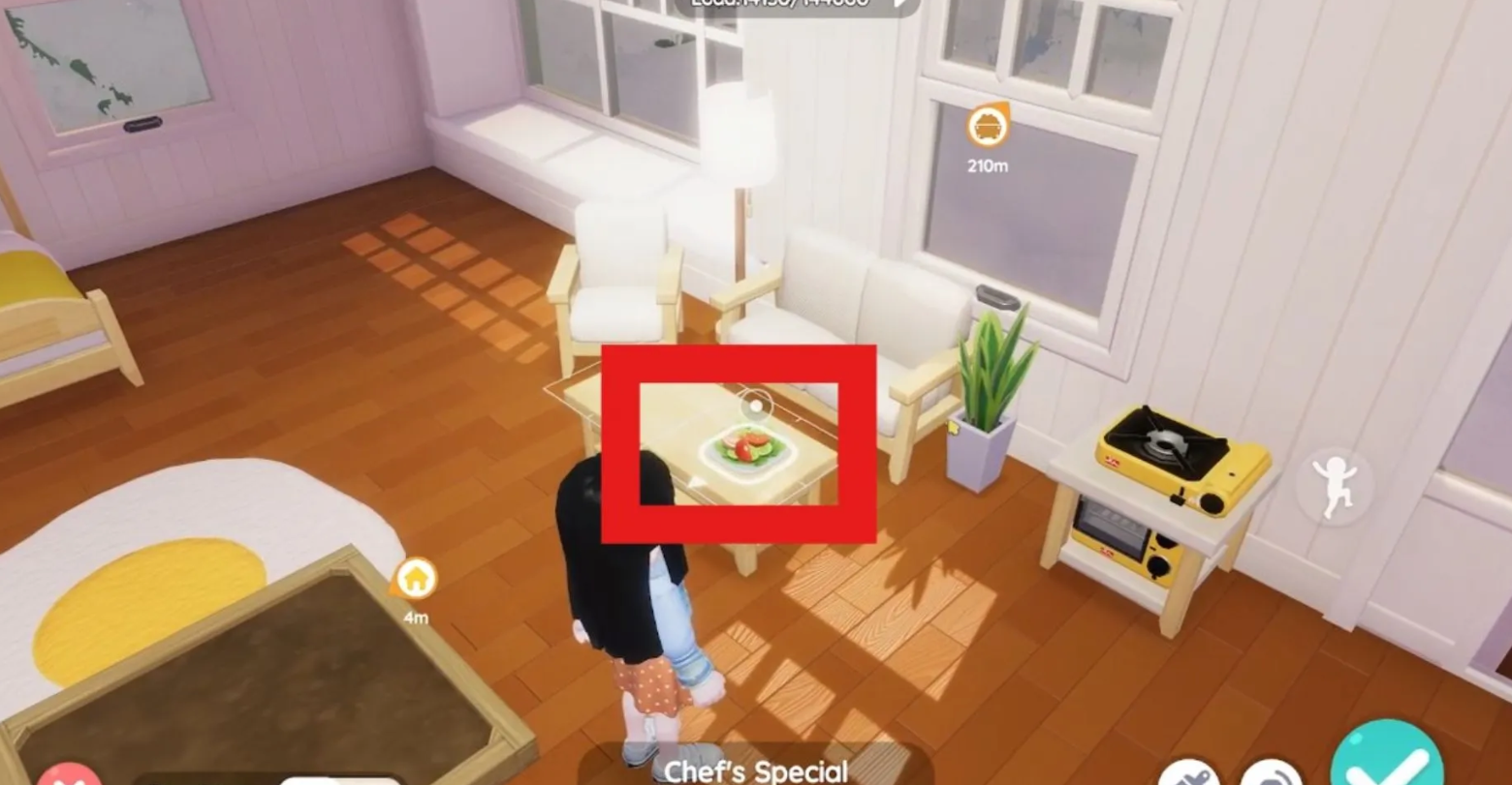 Для выполнения задачи используйте стартовые салаты из инвентаря. Выберите предмет и нажмите не на большую кнопку действия, а на маленький значок с домиком и стрелкой внизу, что переведет игру в режим мебели и позволит поставить блюдо на стол.