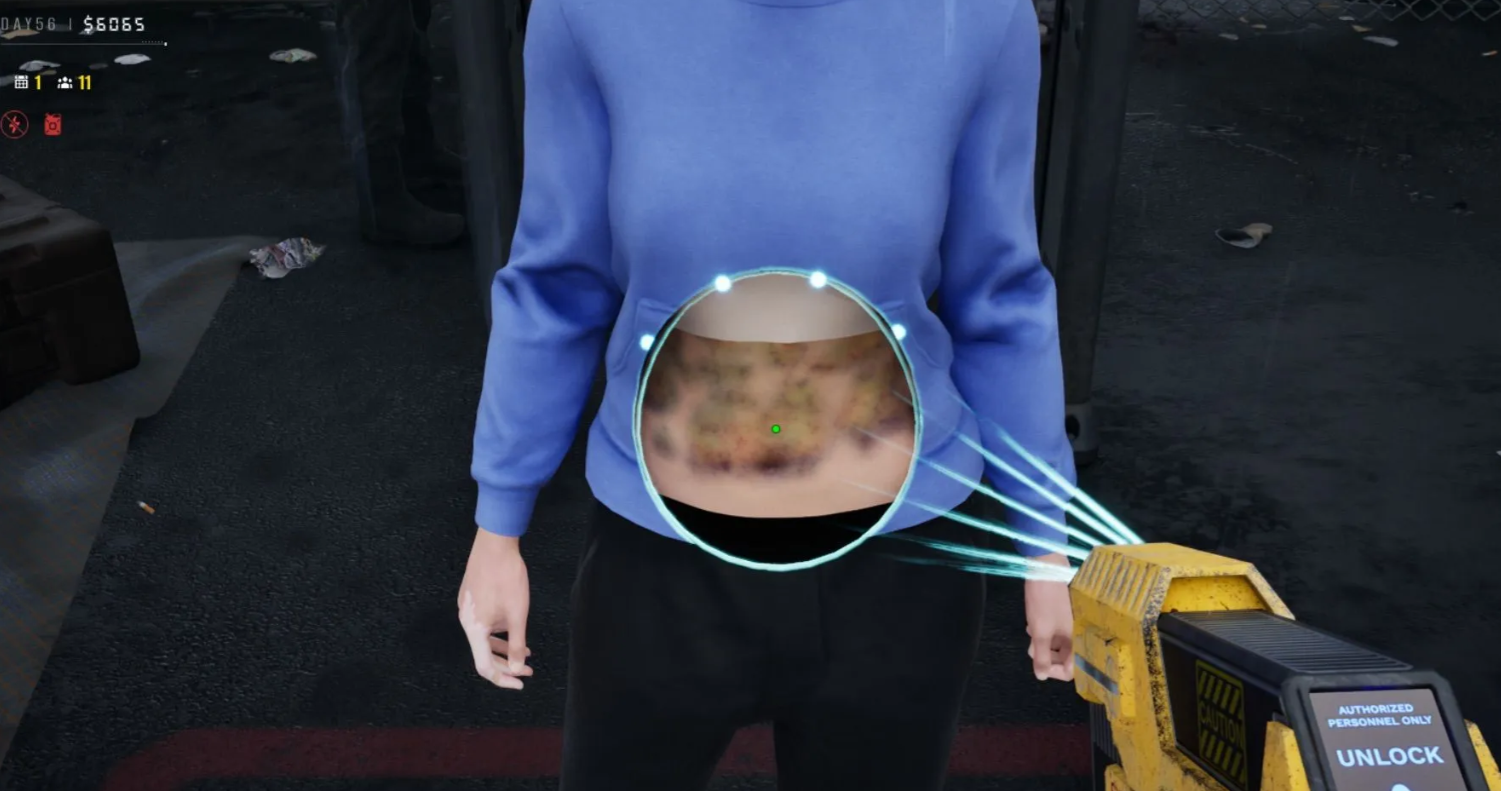 Внимательно сканируйте тело. Когда к посту подойдёт девушка-подросток, используйте сканер, чтобы осмотреть её тело. Вам нужны синяки — они обычно выглядят как зелёные или голубоватые пятна и часто расположены на животе, спине и других частях торса
