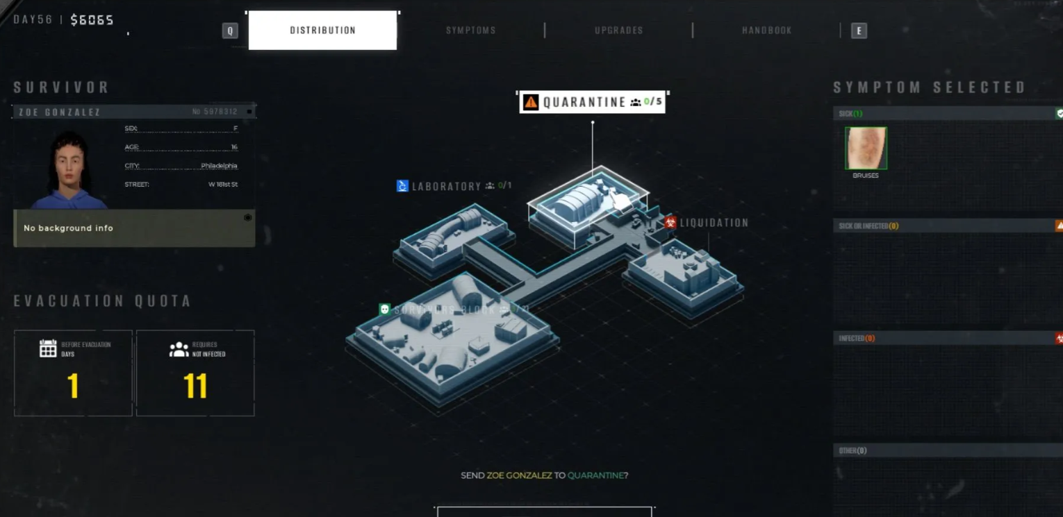 Как только вы подтвердили оба условия, отметьте этот симптом на своём планшете. Выберите действие «Отправить в карантин» (Quarantine). Отправка в жилой блок или на ликвидацию не засчитает выполнение задания. После изоляции девушки квест будет мгновенно завершён, и вы получите 1200$ на свой счёт.