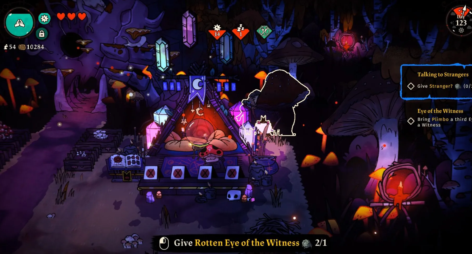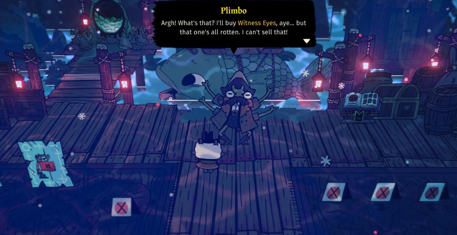 Чтобы использовать Гнилой глаз свидетеля, нужно найти Незнакомца в локации Споровый грот, так как обычный покупатель Плимбо откажется его принимать. За два Гнилых глаза можно получить две эксклюзивные хрупкие реликвии, которые меняют защиту ягнёнка на огненную или ледяную.